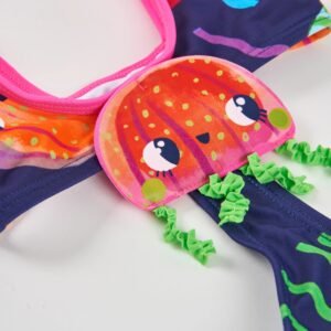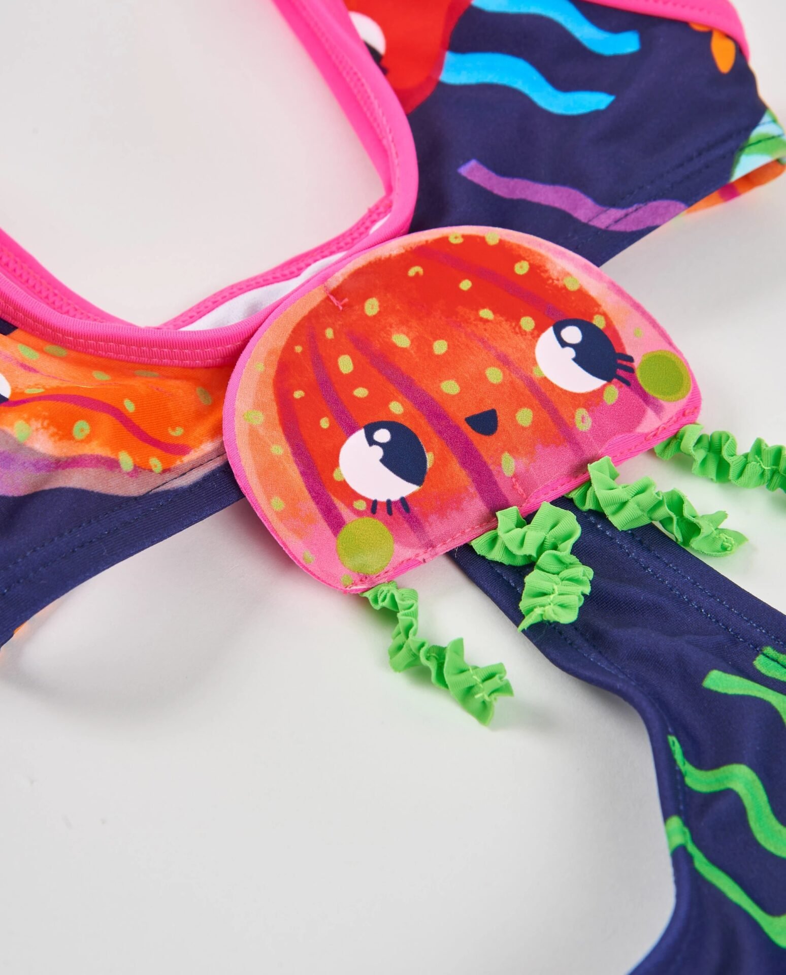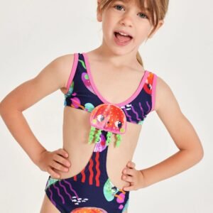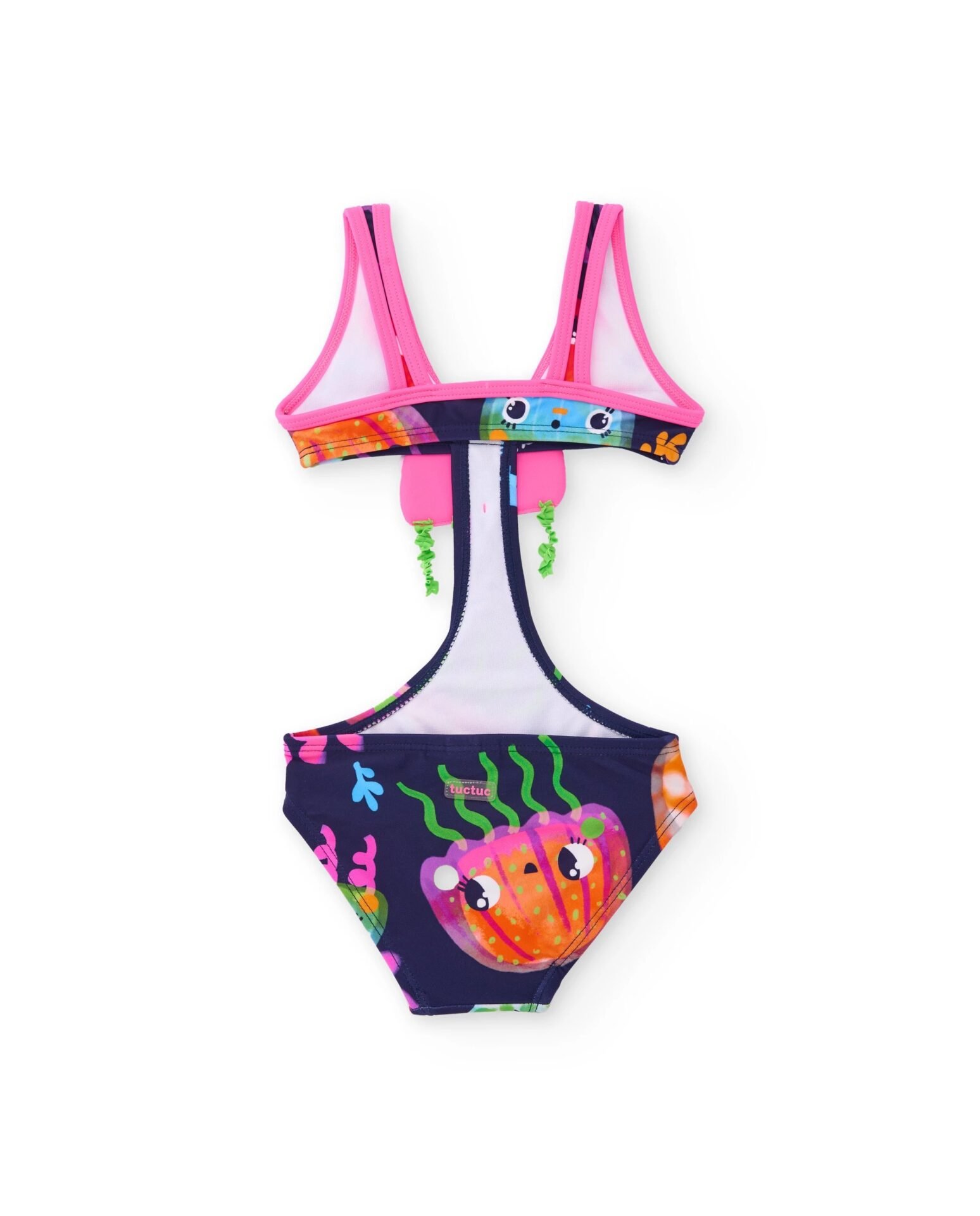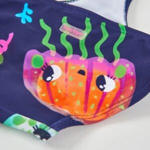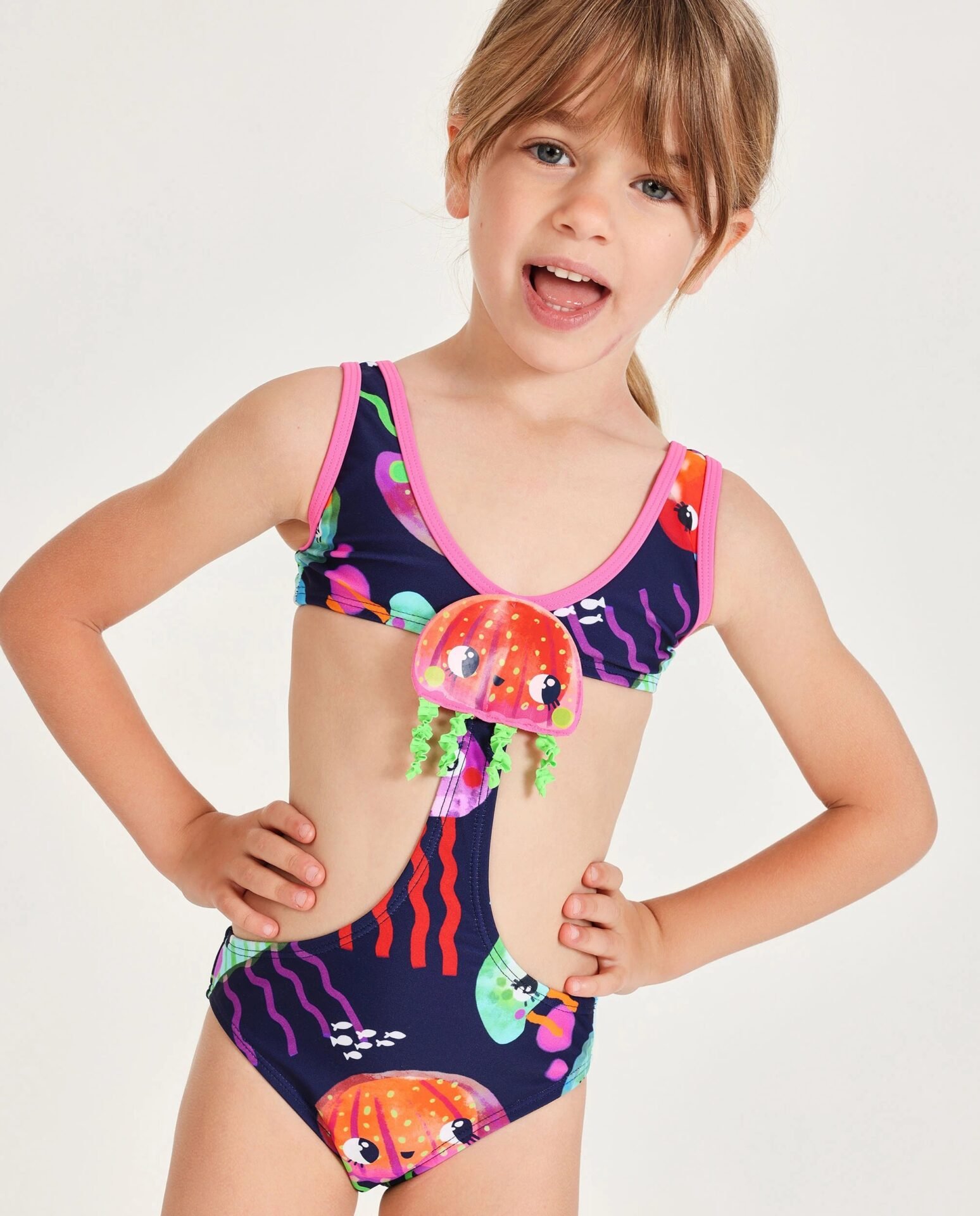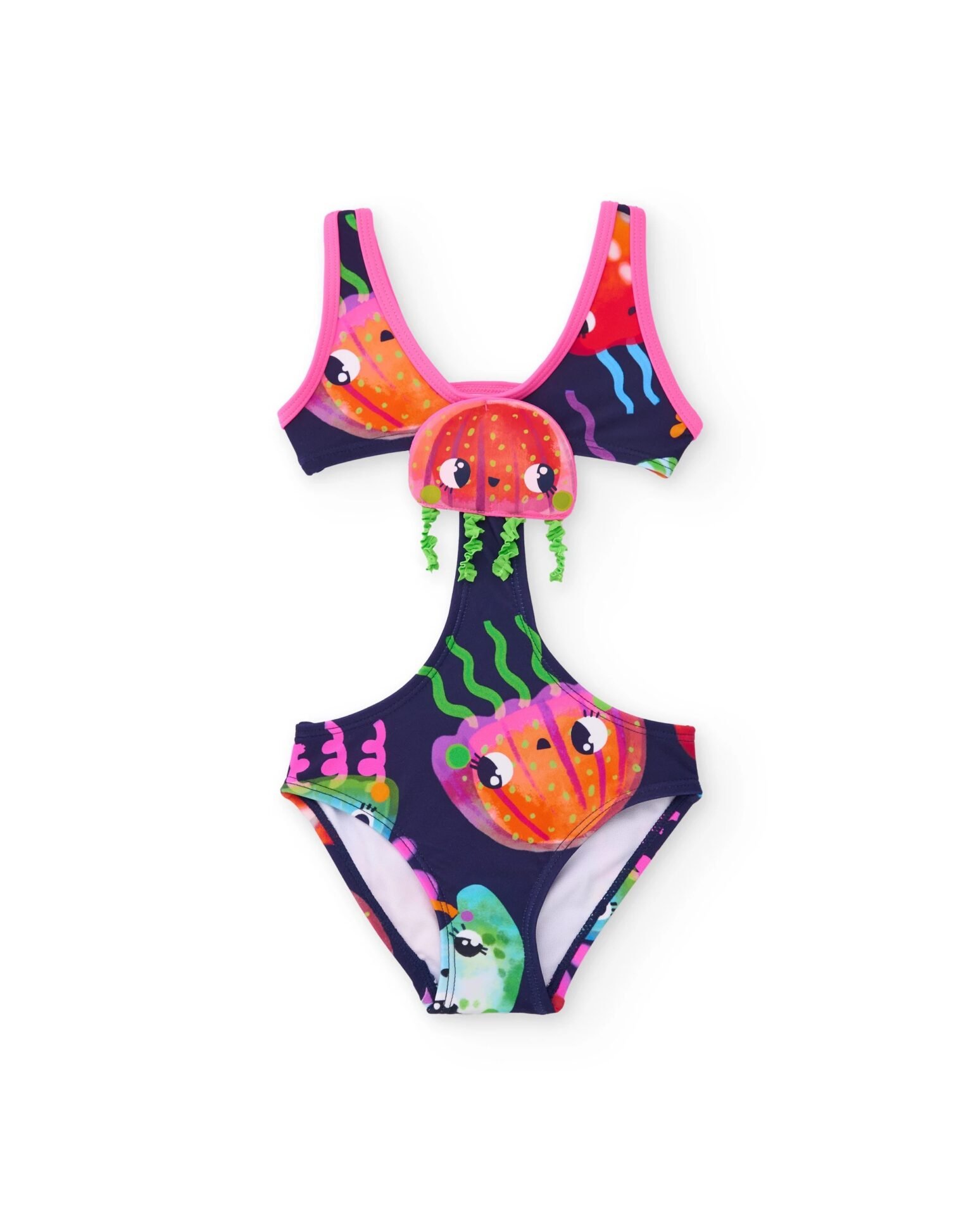Bañador de niña en color azul marino, confeccionado en un tejido elástico y suave que garantiza comodidad durante el baño y el juego. Presenta un original diseño con abertura central y un divertido aplique de medusa en la parte frontal, cuyos tentáculos están realizados con tiras fruncidas que añaden volumen y un efecto dinámico. El estampado marino en tonos vivos aporta un estilo alegre y veraniego, mientras que los ribetes en contraste completan el modelo con un acabado cuidado. Una prenda llamativa y funcional, perfecta para disfrutar de los días de playa o piscina.