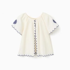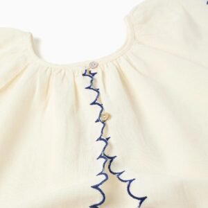 Esta blusa aireada de manga corta beige claro para niña proporciona comodidad y frescura en los días cálidos. Fabricada en tejidos ligeros, destaca por las flores bordadas y el ribete en azul oscuro, que añaden un toque elegante. Esta blusa combinará fácilmente con varios pantalones cortos y faldas, siendo ideal para juegos al aire libre o salidas familiares.