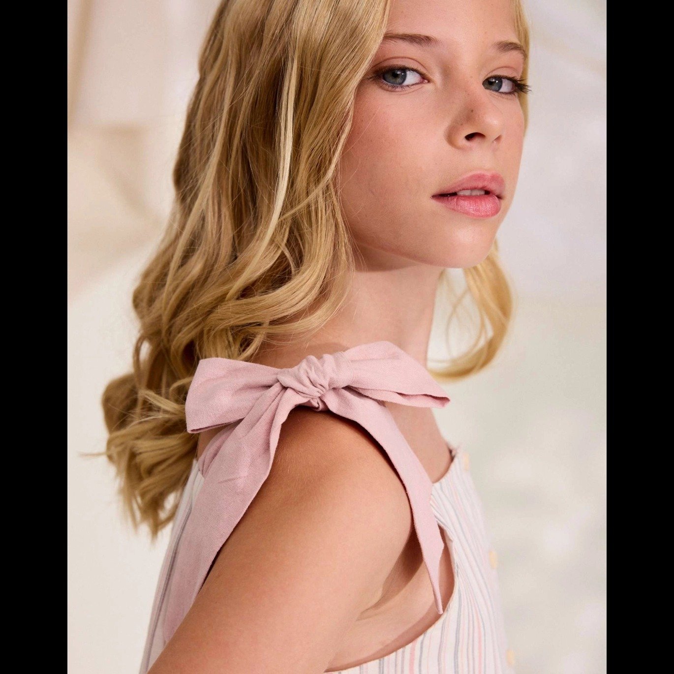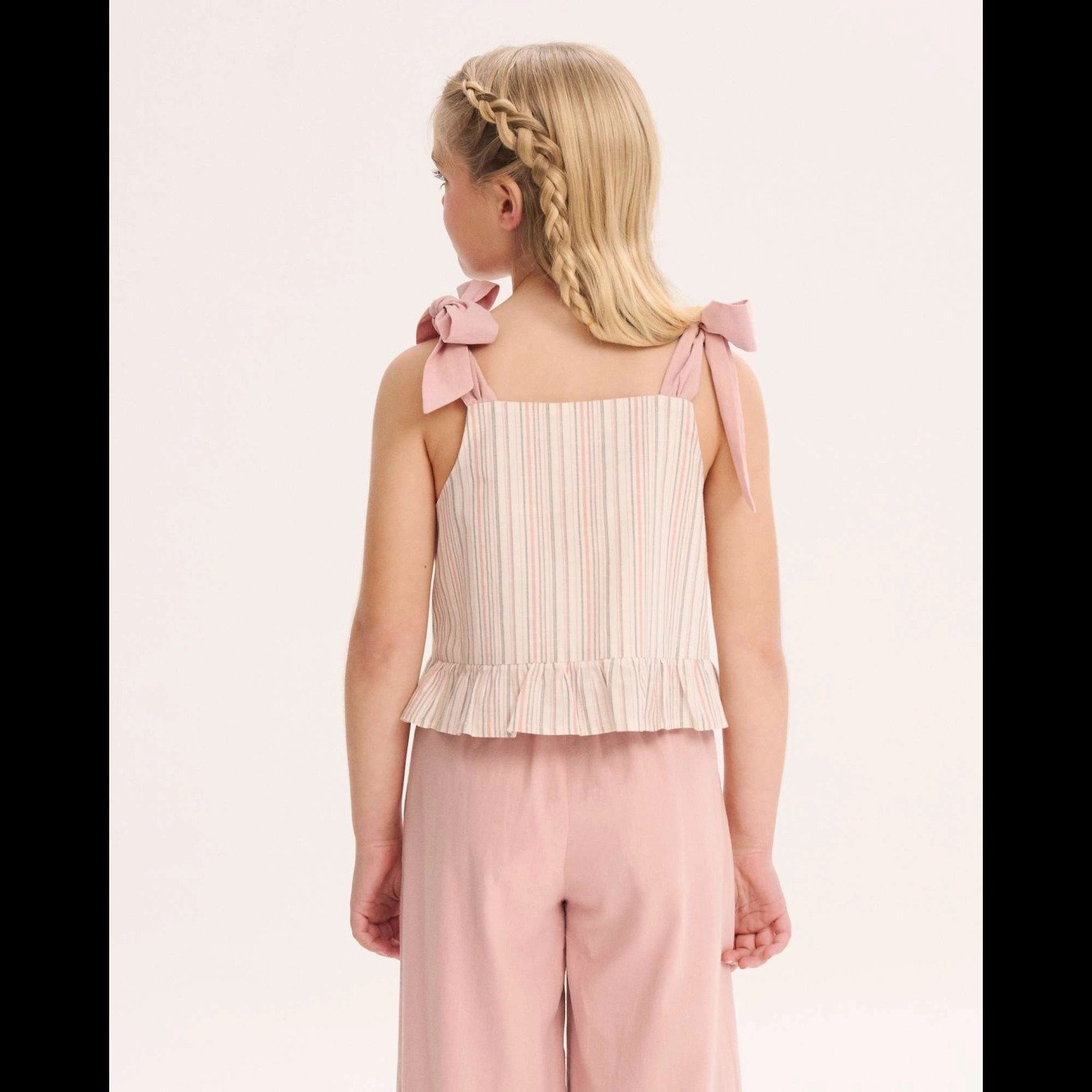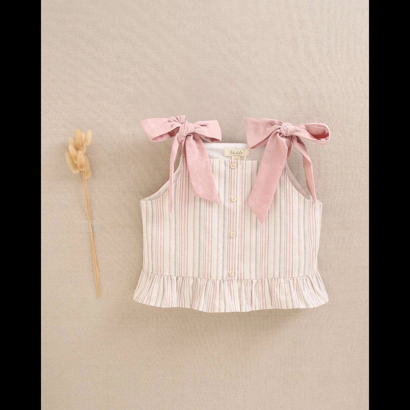 Blusa de niña de rayas rosa y marrón con tirantes ajustables con lazo en color rosa y volante en la parte inferior. Cierre trasero con botones de madera, fresca y veraniega.