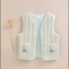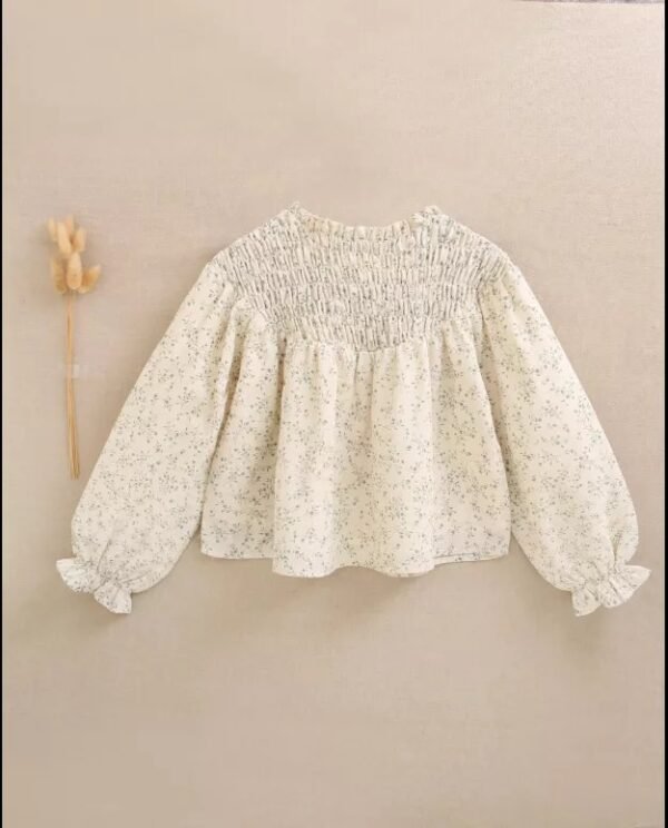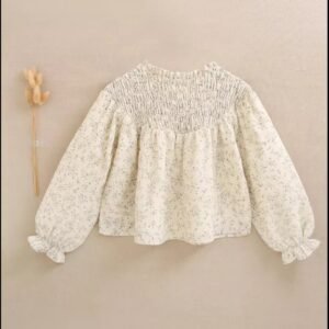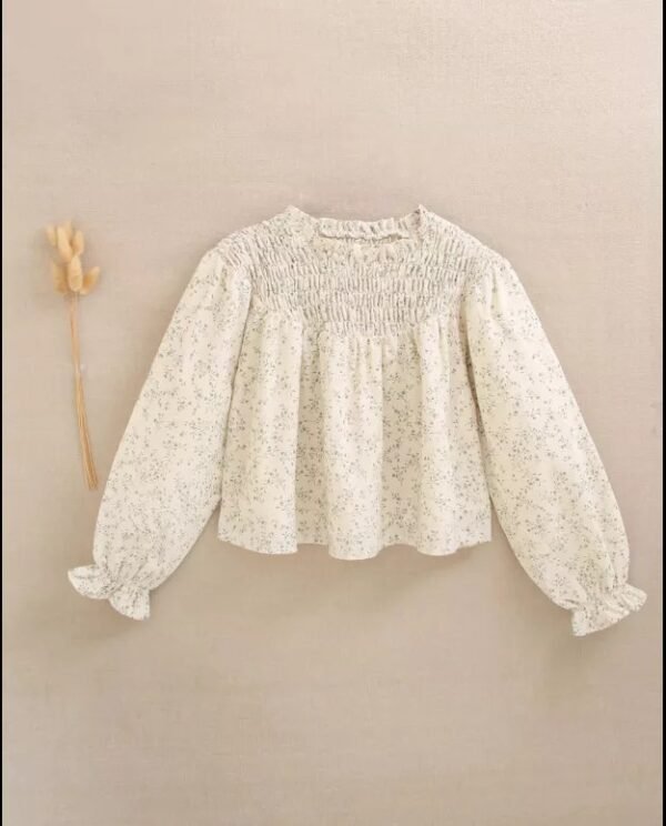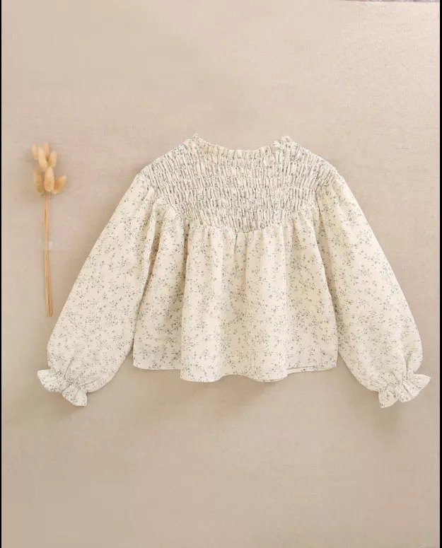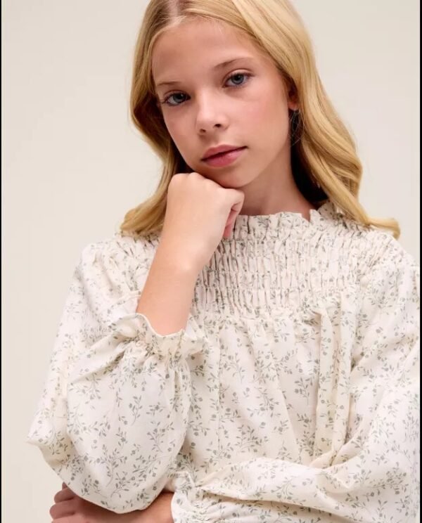 Blusa de niña crudo con estampado floral verde, fruncido en cuello y nido de abeja en parte delantera y espalda y manga larga con puño elástico, elegante y cómoda.