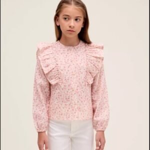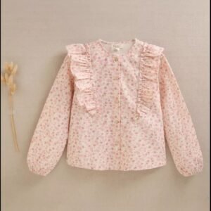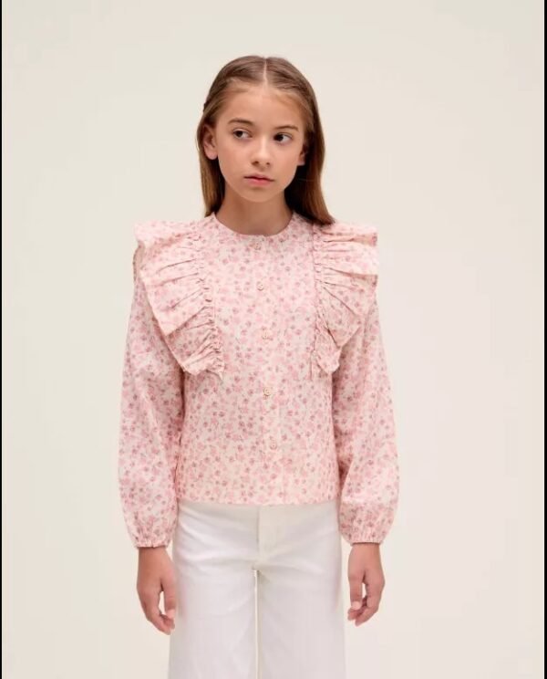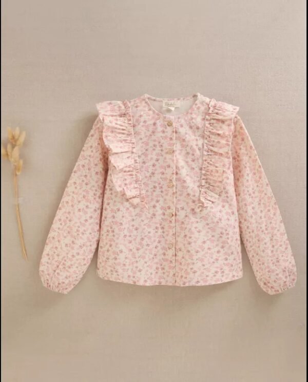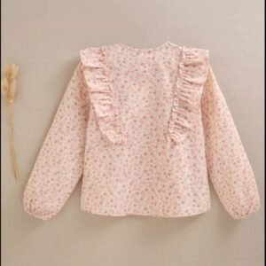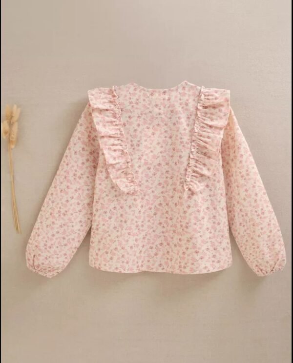 Blusa de niña de flores rosas con volantes laterales en la parte delantera y espalda, cuello mao, puños elásticos y cierre delantero con botones.