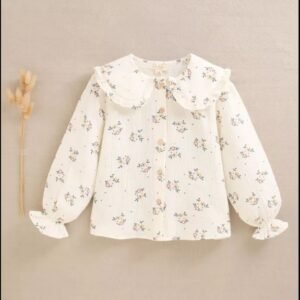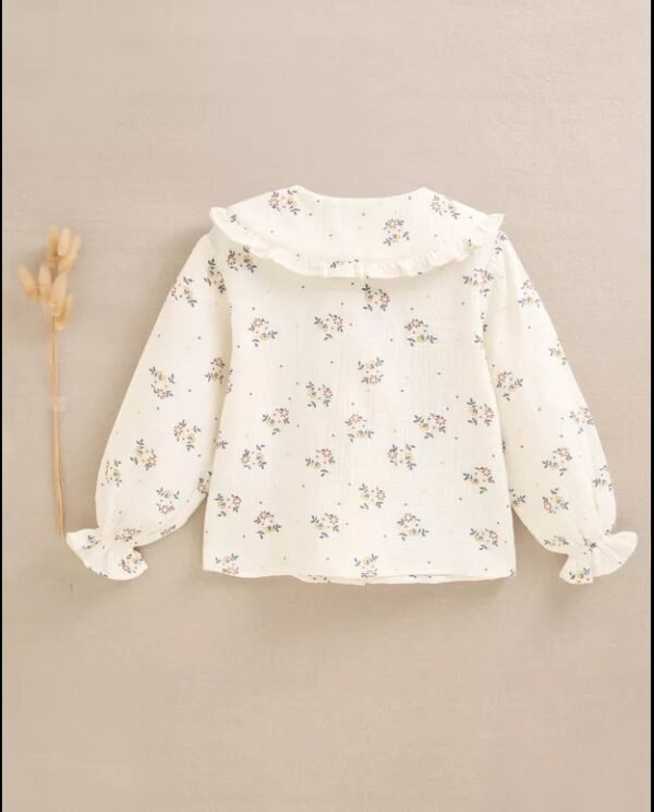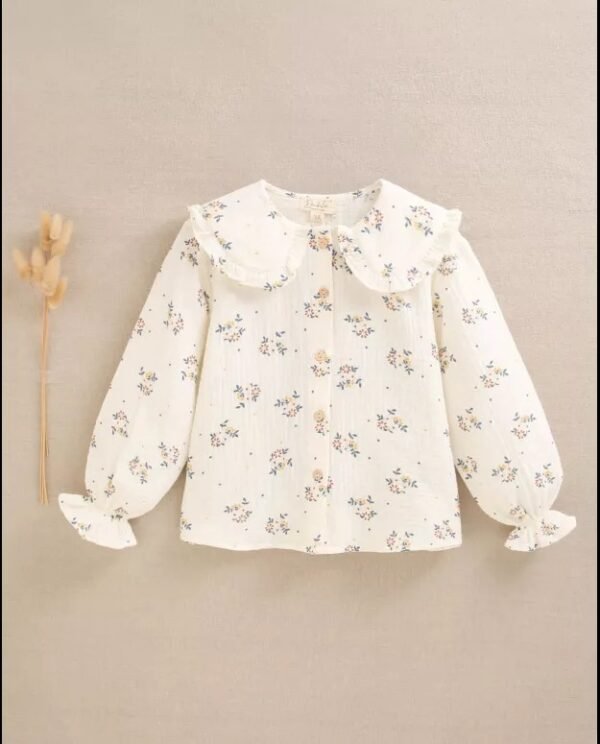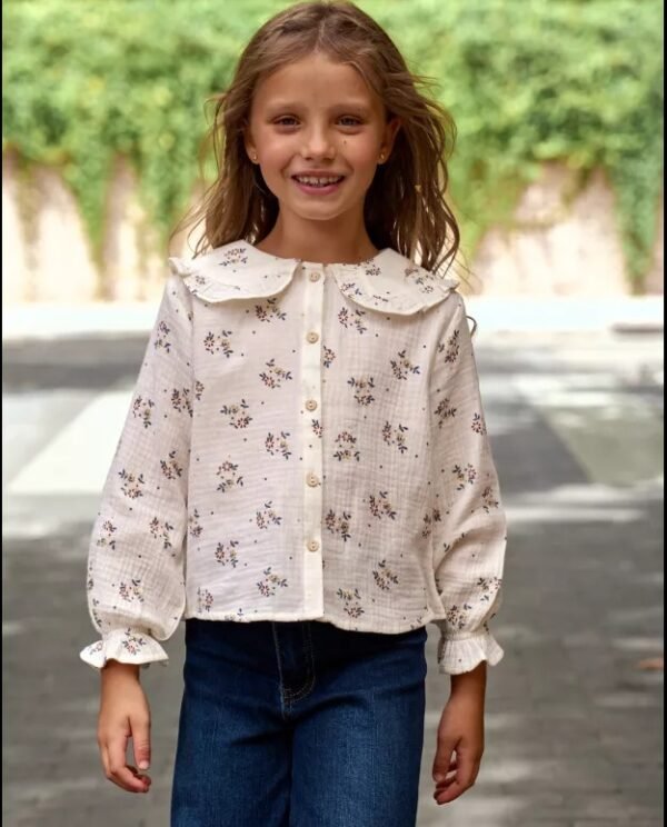 Blusa de niña de muselina de manga larga abullonada color crudo con estampado de flores azul, marrón y amarillo. Cuello estilo Peter Pan con fruncido.
