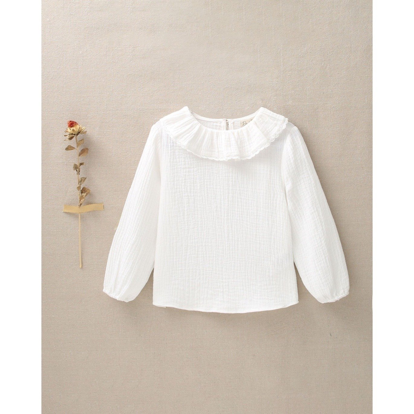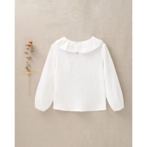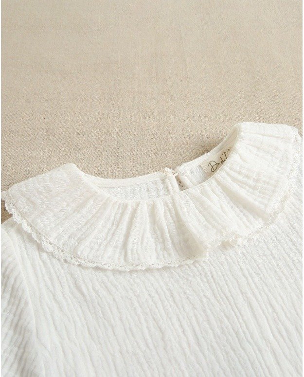 Blusa de niña de manga larga con cuello de volantes y cinta de puntilla con elásticos en el puño y en muselina blanca