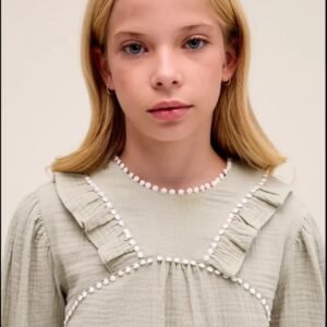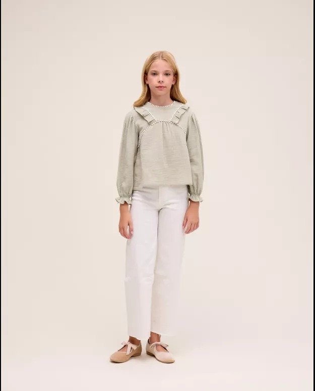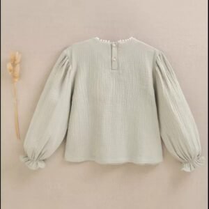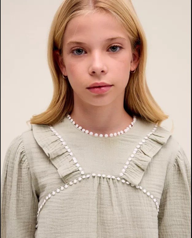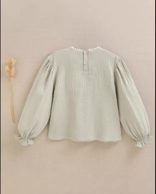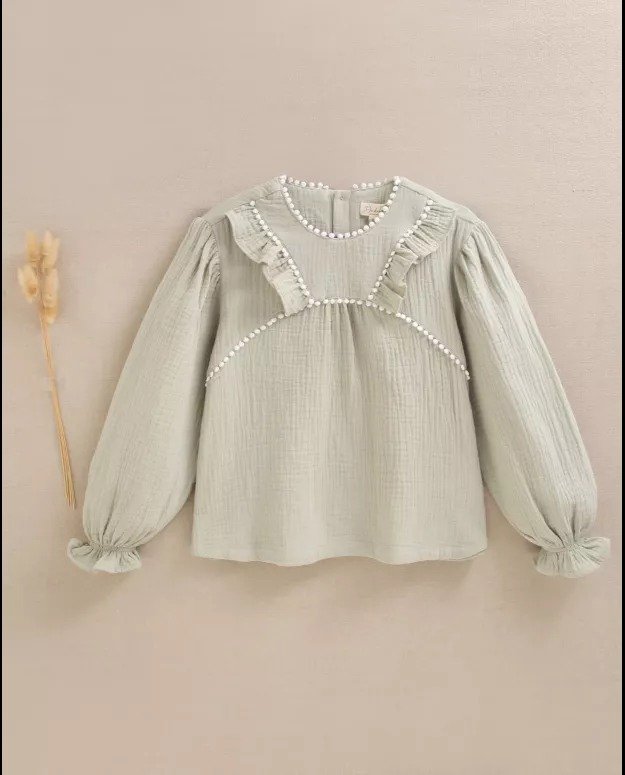 Blusa de niña muselina color verde con manga larga abullonada y volantes en puños y borlas blancas en el cuello y en la parte delantera.