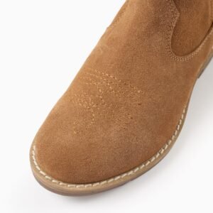 Botas tejanas en ante camel para niña. Bordados en la parte delantera. Con cierre de cremallera y tira autoadherente para facilitar su puesta. Plantilla acolchada para un máximo confort. Suela de goma con efecto antideslizante. Botas cómodas y atemporales. Big Me: Plantillas con diseño semicircular para que tu hijo identifique fácilmente el pie que le corresponde, fomentando su autonomía.
