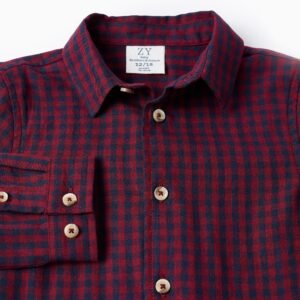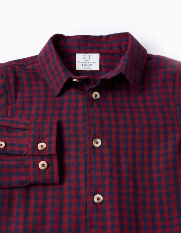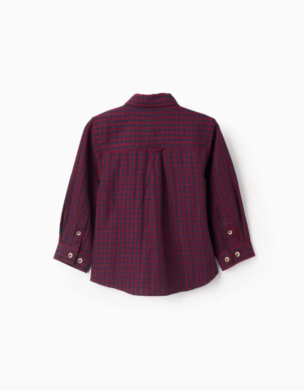 Camisa con patrón Vichy rojo y azul oscuro para bebé niño, 100% algodón. Botones en color contraste. Base redondeada. ¡Una opción versátil y elegante! Big Me: un botón con hilo y ojal en contraste para que el niño identifique fácilmente dónde empezar a abotonar, promoviendo su autonomía