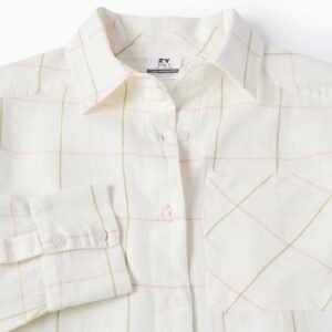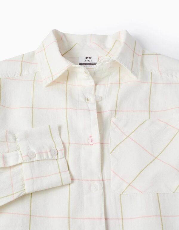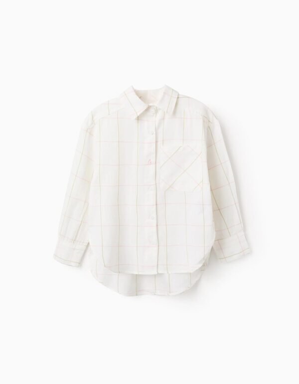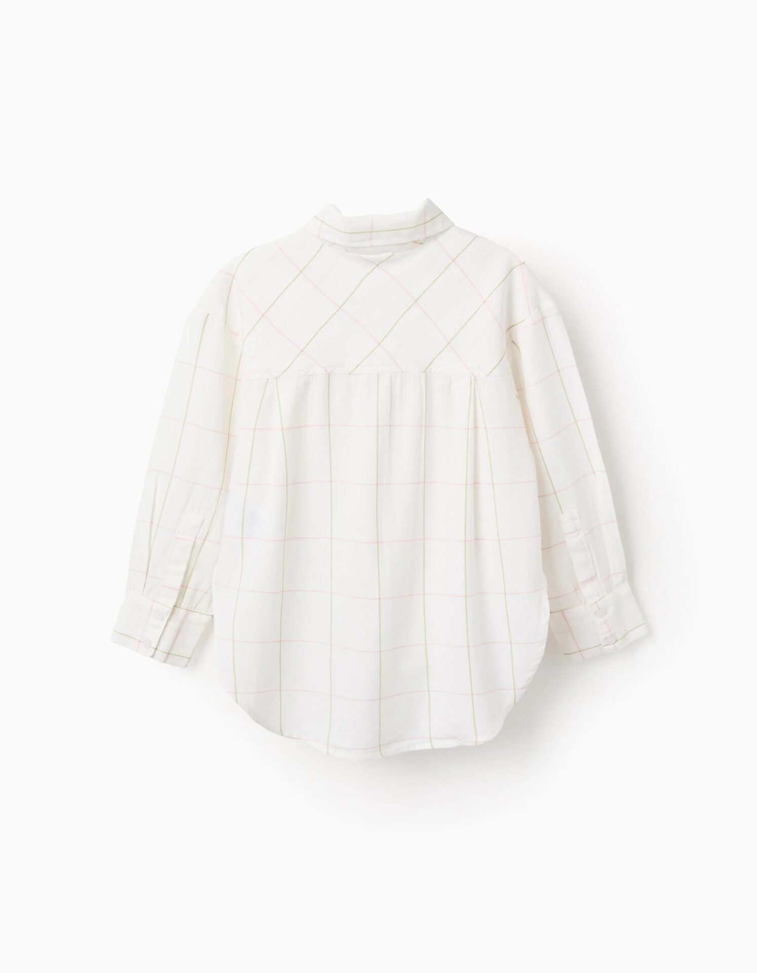 Camisa blanca de sarga 100% algodón para niña, con patrón de cuadros en tonos de verde y rosa. Hombros caídos y bolsillo en el pecho. Base redondeada y asimétrica, un poco más larga por detrás, con pequeñas aberturas en los laterales. Corte amplio y ligeramente oversize, para looks modernos con un toque clásico. Big Me: un botón con hilo y ojal en contraste para que la niña identifique fácilmente dónde empezar a abotonar, promoviendo su autonomía.