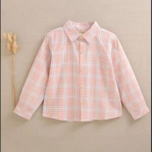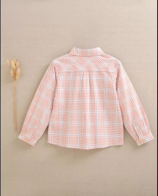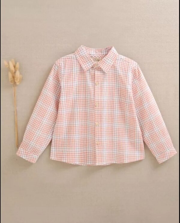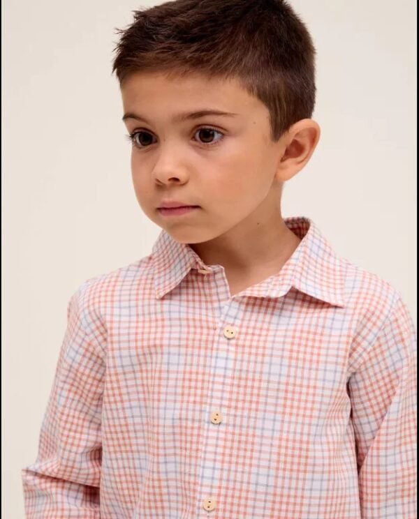 Camisa de niño cuadros azul, blanco y naranja, cuello pico y cierre delantero con botones de madera, práctica y elegante para vestir a diario.