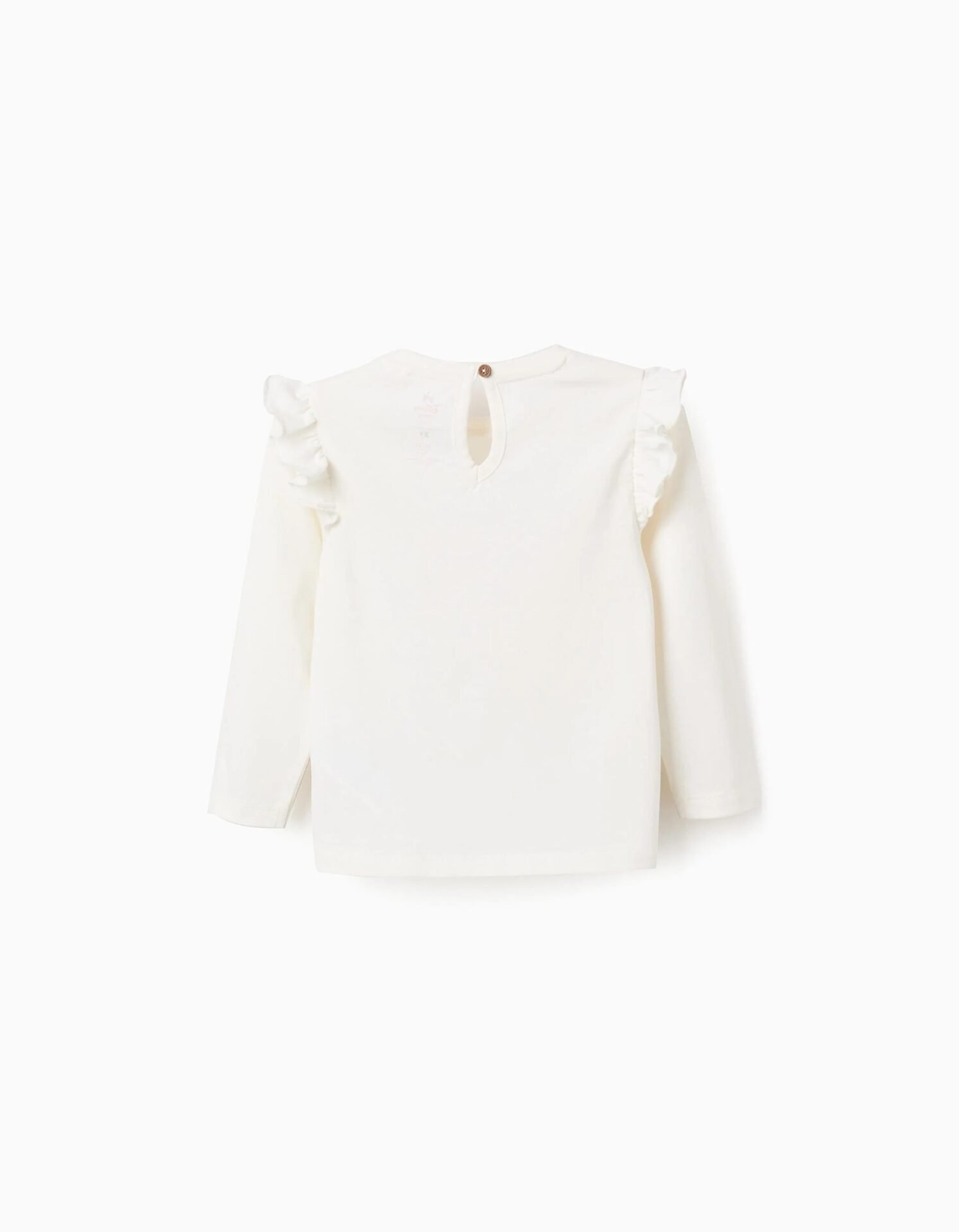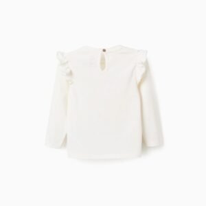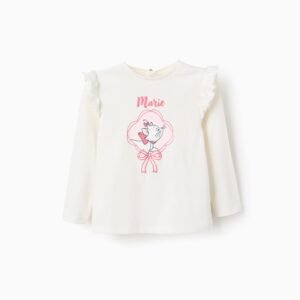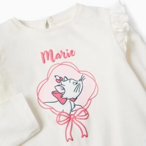 Camiseta de manga larga blanca para bebé niña, 100% algodón. Estampado frontal de Marie de Los Aristogatos, con detalles en relieve. Volantes alrededor de los hombros. Botón en la espalda para vestir fácilmente. Etiqueta interior estampada para no irritar la piel. ¡Una camiseta suave y adorable!
