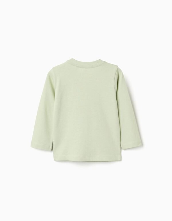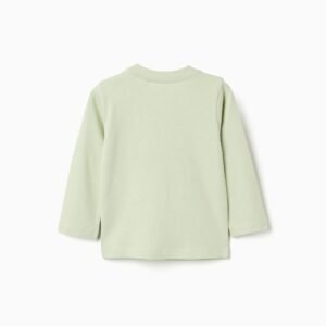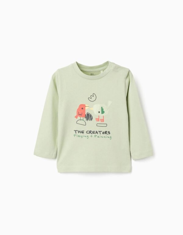 Camiseta de algodón de manga larga verde claro para bebé niño, ideal para las actividades diarias. Confeccionada en algodón suave, proporciona una sensación agradable en la delicada piel de tu pequeño. Presenta un estampado frontal de dos pájaros, en tonos naranja, amarillo y negro. Es una excelente opción para el uso diario, perfecto para combinar con otras prendas de entretiempo.