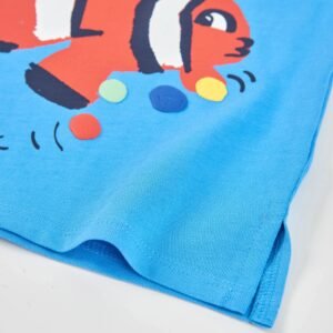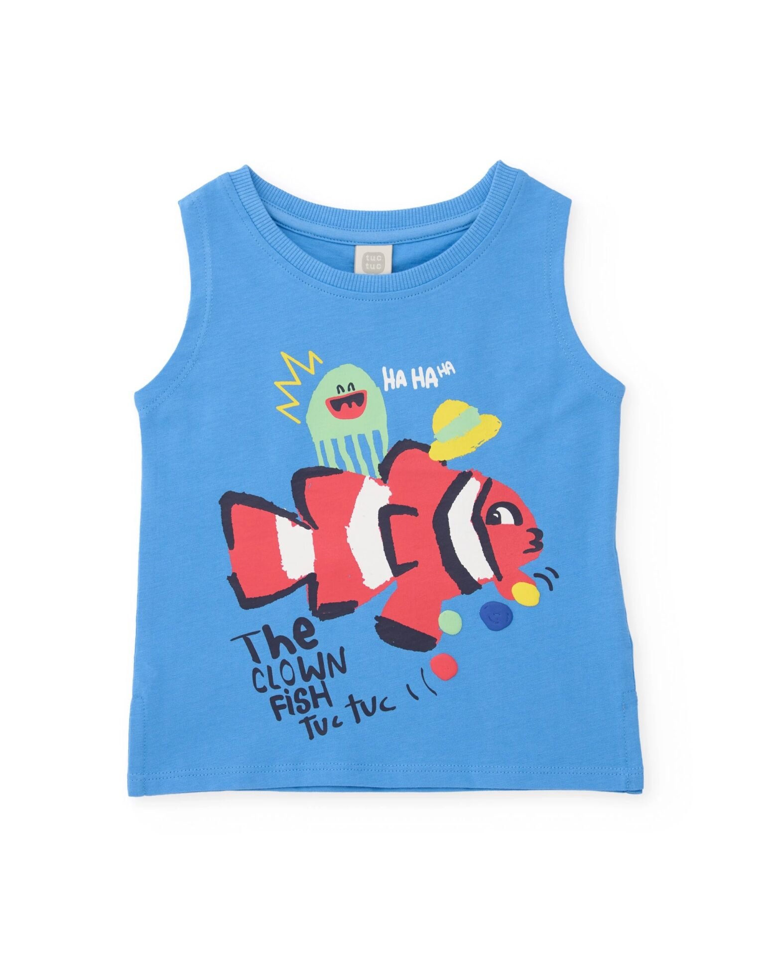Camiseta de tirantes de niño en azul, confeccionada en un tejido suave y ligero que resulta muy cómodo para los días más cálidos. El diseño destaca por su llamativo estampado frontal, protagonizado por un pez payaso acompañado de un simpático personaje que aporta un toque humorístico y lleno de energía. El acabado del cuello y las sisas, rematados con un vivo tono a juego, garantiza un ajuste confortable y resistente al uso diario. Una prenda fresca y divertida, ideal para completar conjuntos veraniegos con un estilo alegre y desenfadado.