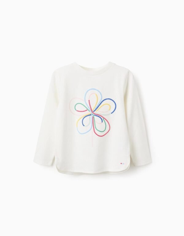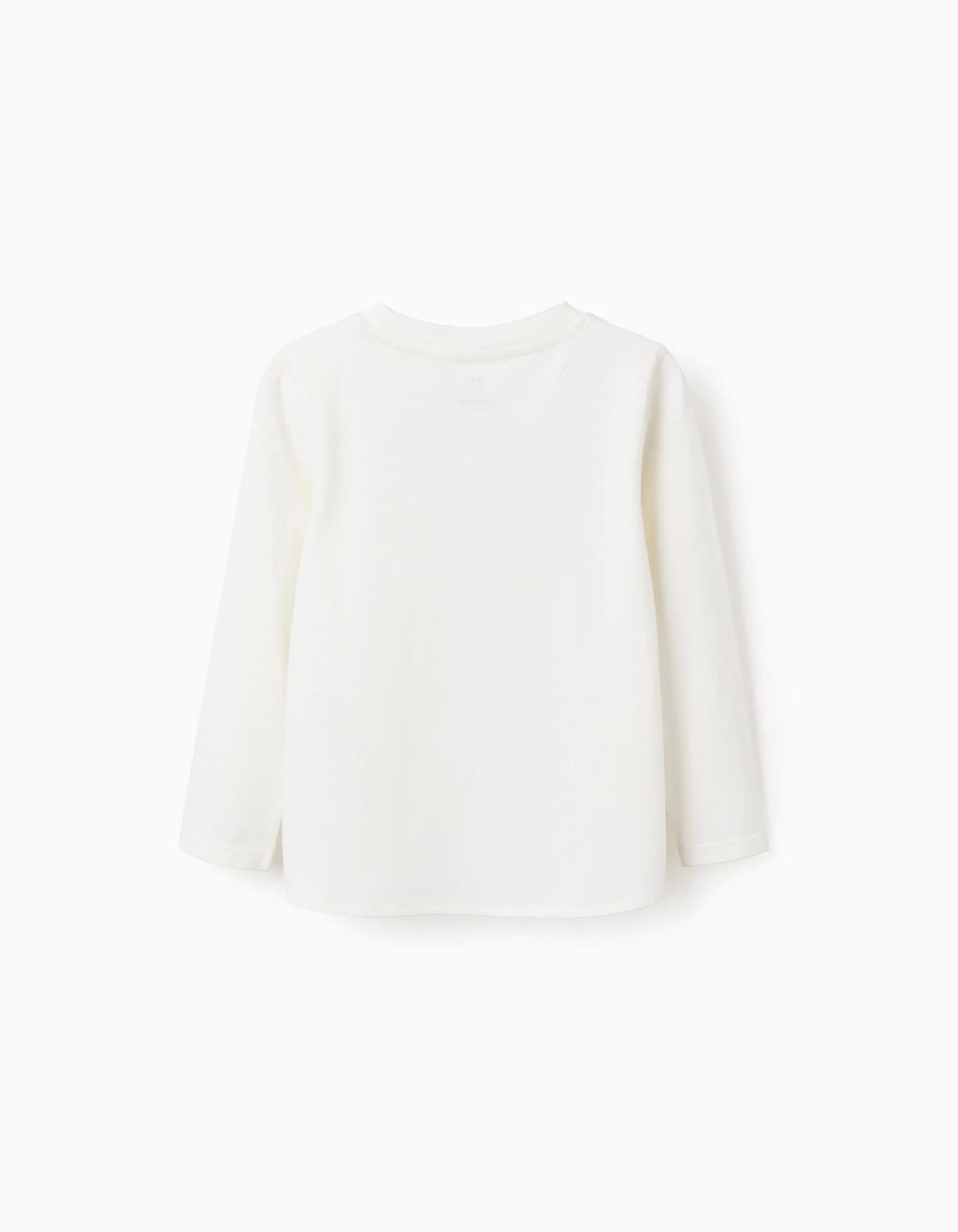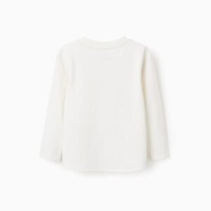 Camiseta blanca de manga larga para niña, 100% algodón. Estampado frontal de colores con detalles en relieve. Dobladillo redondeado con pequeñas aberturas a los lados. Etiqueta interior impresa para no irritar la piel. ¡Una elección suave y original! We Care: artículo con certificación Oeko-Tex Standard 100, que garantiza la ausencia de sustancias nocivas o irritantes para la piel.
