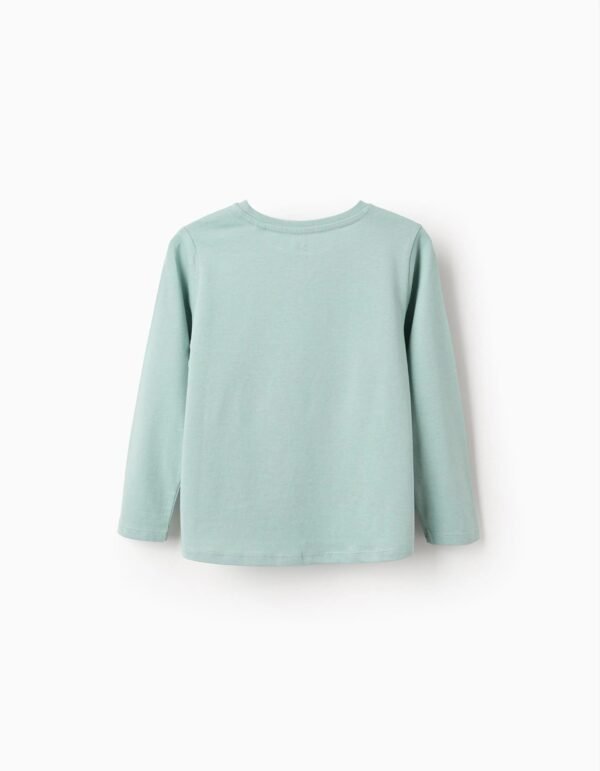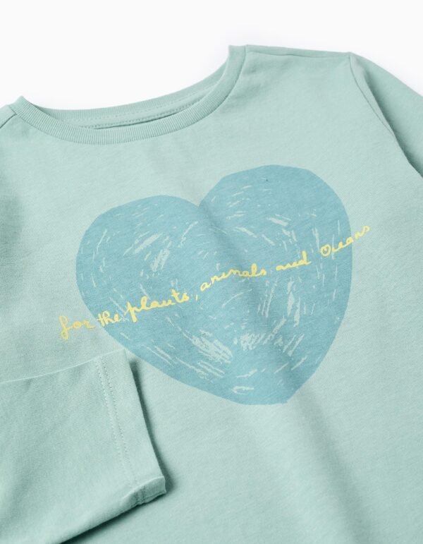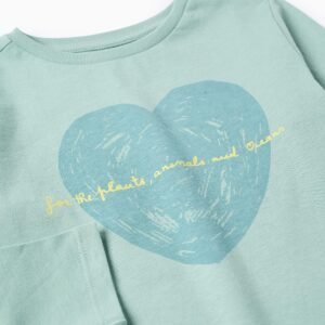 Camiseta de manga larga verde para niña, 100 % algodón. Estampado frontal. Etiqueta interior estampada para no irritar la piel. Corte evasé y bajo ligeramente asimétrico. ¡Para los looks de todos los días! We Care: artículo con certificado Oeko-Tex Standard 100, que garantiza la ausencia de sustancias nocivas o irritantes para la piel.