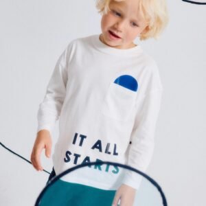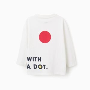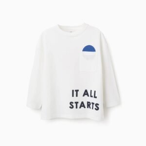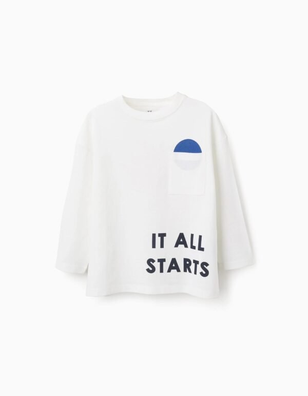 Camiseta blanca de manga larga para niño, 100% algodón. Bolsillo en el pecho. Estampados en la parte delantera y en la espalda. Etiqueta interior estampada para no irritar la piel. ¡Una camiseta original para looks únicos! We Care: artículo con certificado Oeko-Tex Standard 100, que garantiza la ausencia de sustancias nocivas o irritantes para la piel.
