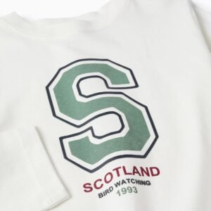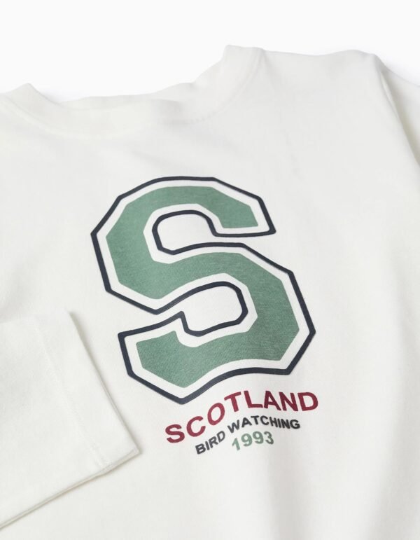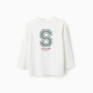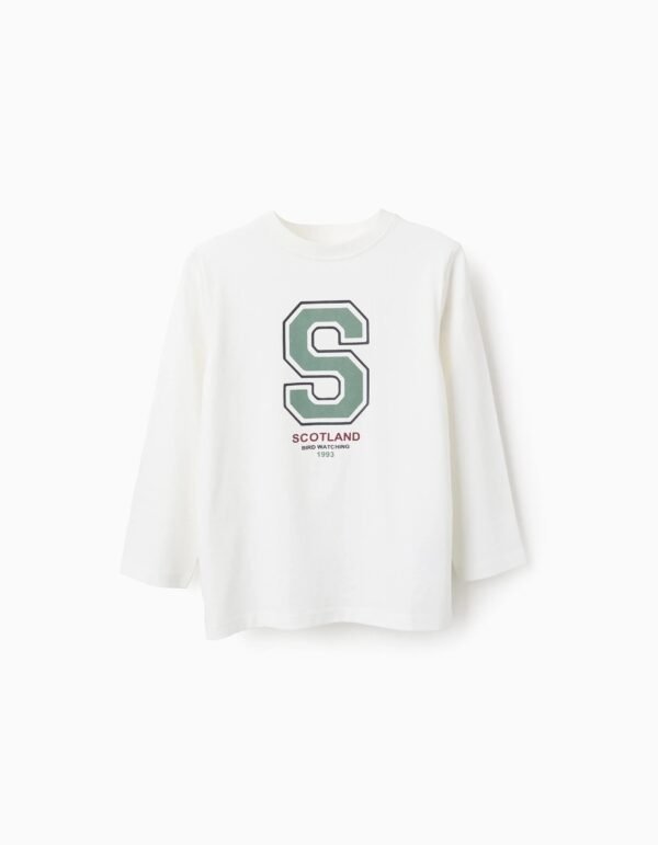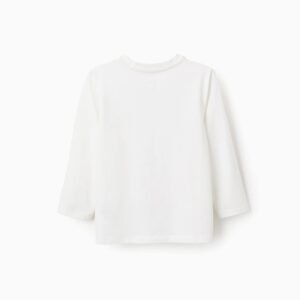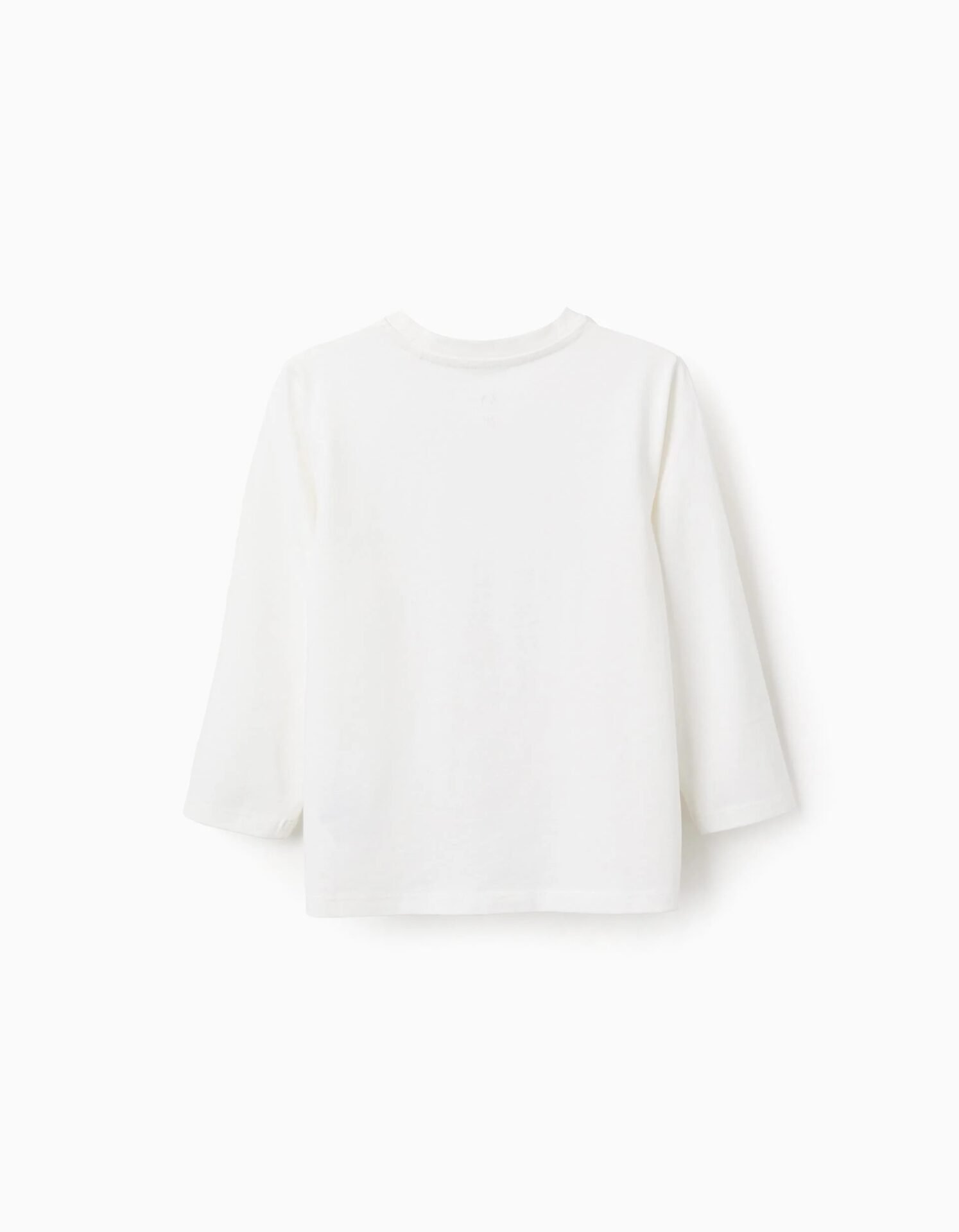 Camiseta blanca de manga larga para niño, 100% algodón. Estampado frontal con detalles en relieve. Etiqueta interior estampada para no irritar la piel. We Care: artículo con certificado Oeko-Tex Standard 100, que garantiza la ausencia de sustancias nocivas o irritantes para la piel. ¡Una opción perfecta para el día a día!
