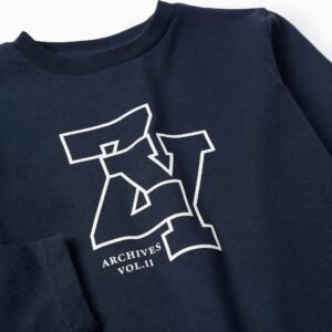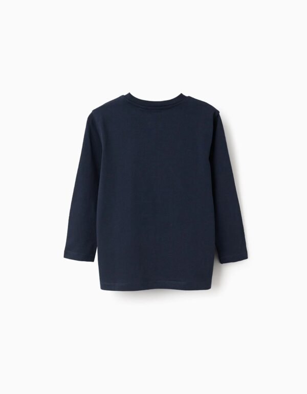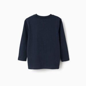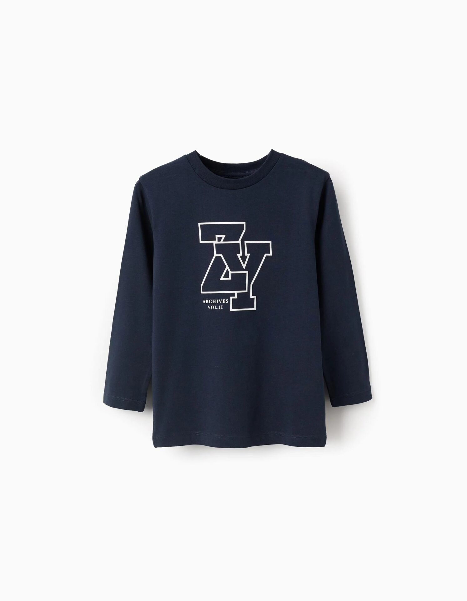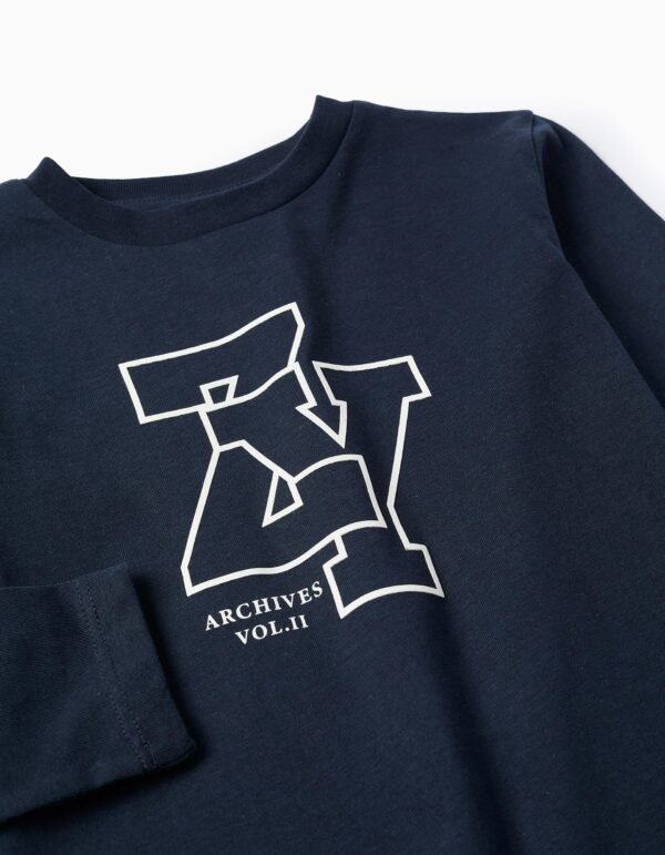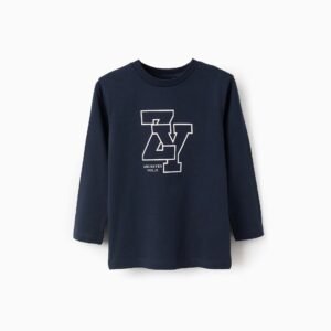 Camiseta azul oscuro de manga larga para niño, 100 % algodón. Estampado ZY en la parte delantera. Etiqueta interior impresa para no irritar la piel. Una opción versátil para todos los estilos.