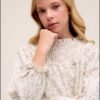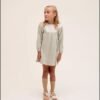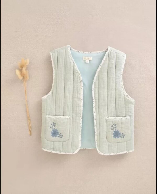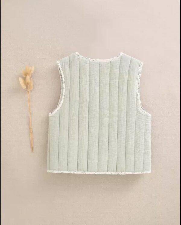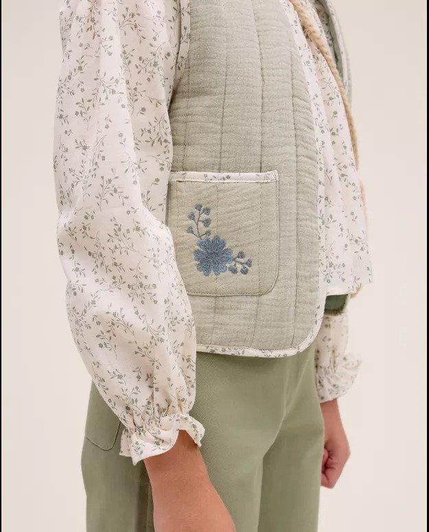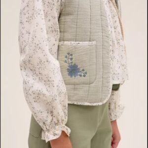 Chaleco de niña verde con flor bordada en bolsillos y ribete blanco con estampado de hojas y textura acolchada, cálido y estiloso para cualquier ocasión.