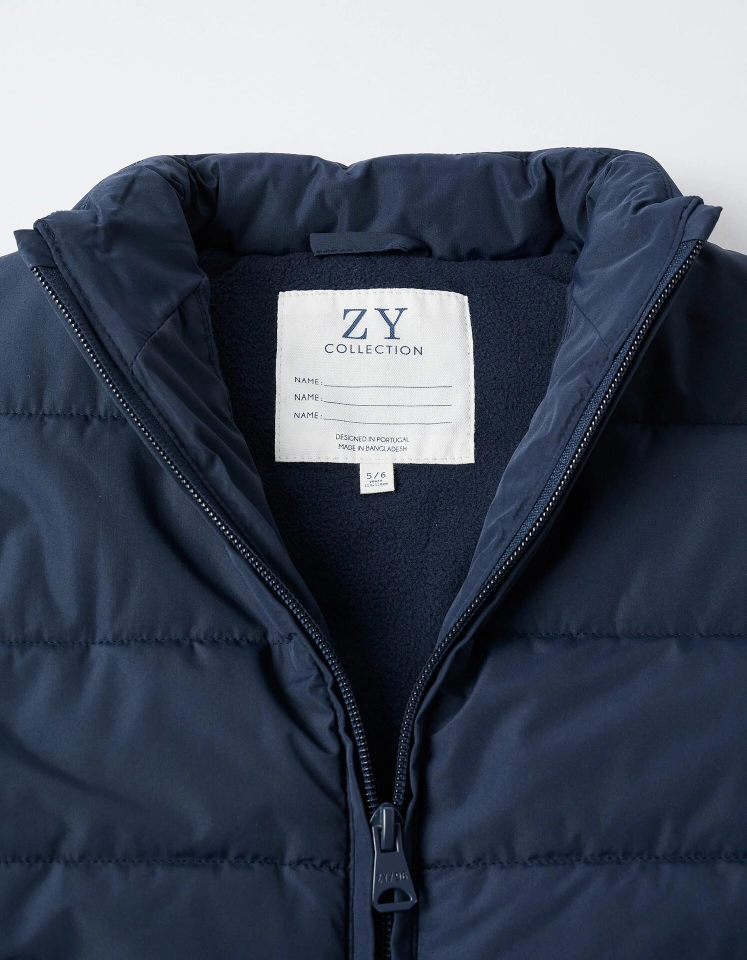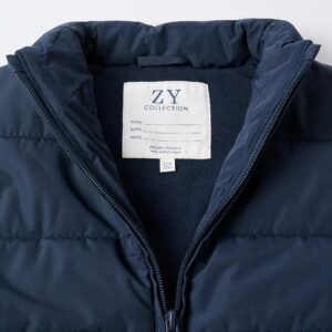 Chaleco acolchado azul oscuro para niño, con forro polar para mayor calidez. Cuello semialto. Cierre con cremallera para vestirse fácilmente. Bolsillos laterales. Etiqueta interior para el DNI del niño. Una prenda versátil y cómoda, perfecta para los días más frescos. We Care: esta prenda está rellena de poliéster reciclado.