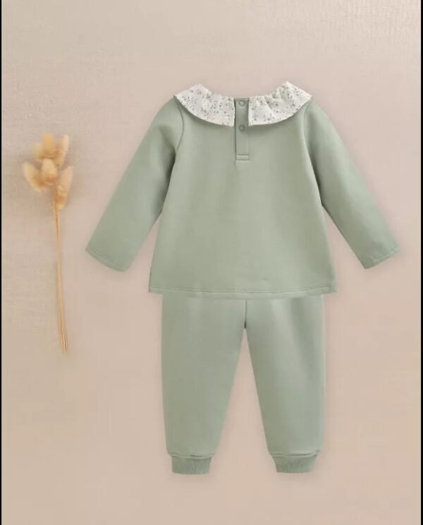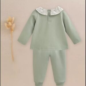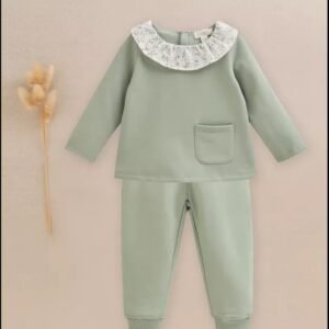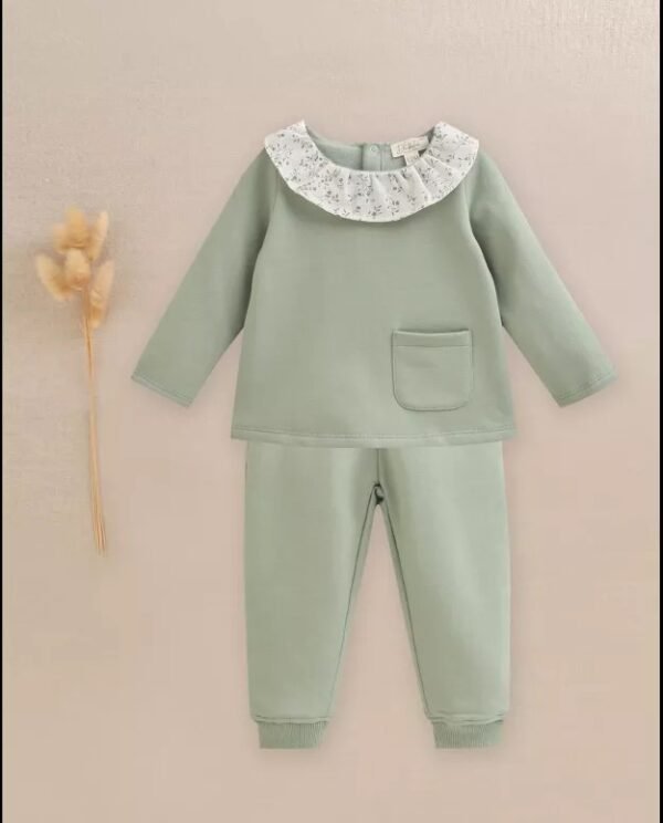Conjunto de bebé niña de sudadera verde y pantalón, cuello con volante con hojas azul, puño elástico y bolsillos, cómodo y adorable.