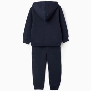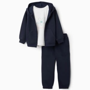 Conjunto de tres piezas para niña. Incluye una chaqueta azul oscuro con capucha, bolsillo canguro y cierre frontal con cremallera; un pantalón de chándal azul oscuro con bolsillos y cordón. Ambas prendas son de mezcla de algodón, con interior perchado para mayor confort térmico y extremos elásticos y acanalados, para un ajuste perfecto. También incluye una camiseta blanca de manga larga, con un estampado frontal de una flor. 100 % algodón. ¡El conjunto perfecto para las actividades escolares! We Care: artículo con certificación Oeko-Tex Standard 100, que garantiza la ausencia de sustancias nocivas o irritantes para la piel.