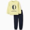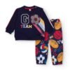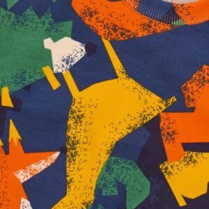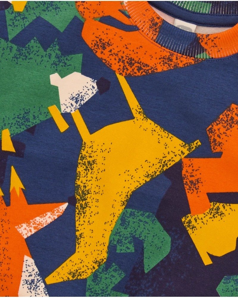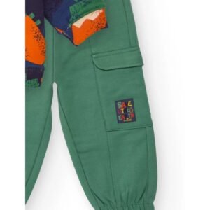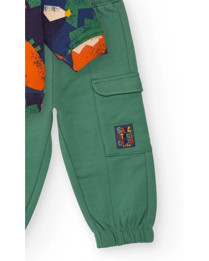 Conjunto para niño compuesto por una sudadera de estampado multicolor con figuras geométricas de inspiración animal y un pantalón tipo jogger en color verde. La sudadera presenta un ajuste cómodo con cuello redondo y detalle de broches en el hombro para facilitar el vestir. El pantalón cuenta con cintura elástica, bolsillos tipo cargo y tobillos ajustados para mayor confort. Un conjunto divertido y funcional, ideal para aventuras diarias con estilo.