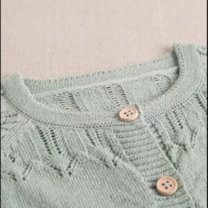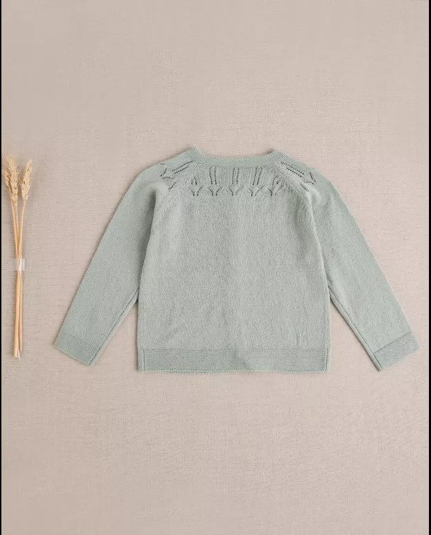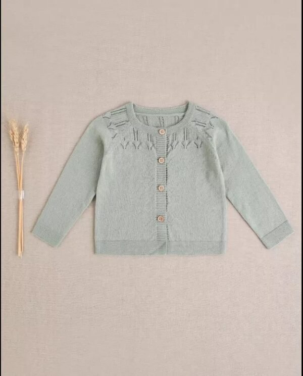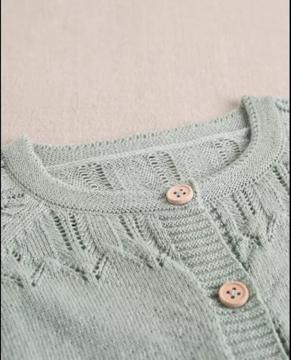 Chaqueta de bebé niña verde de punto con cuello redondo con detalle calado, manga larga y botones de madera, suave y encantadora.