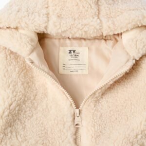 Chaqueta de sherpa beige con capucha para bebé niño. Bolsillos laterales. Puños y base elásticos para un ajuste perfecto. Se cierra fácilmente con cremallera. Etiqueta interior para poner el nombre del niño. Una opción versátil y acogedora.