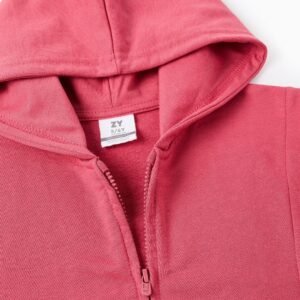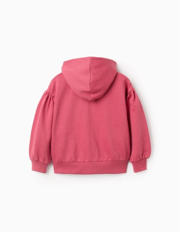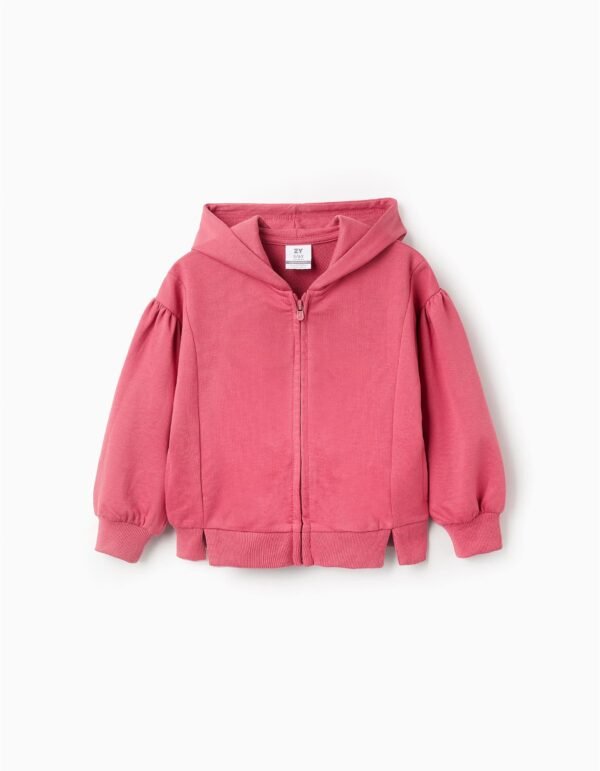 Chaqueta rosa con capucha para niña, con hombros caídos y mangas ligeramente abullonadas. Bolsillos laterales. Bajo acanalado con pequeñas aberturas. Se abrocha fácilmente con cremallera. ¡Ideal para el día a día! We Care: artículo con certificado Oeko-Tex Standard 100, que garantiza la ausencia de sustancias nocivas o irritantes para la piel.