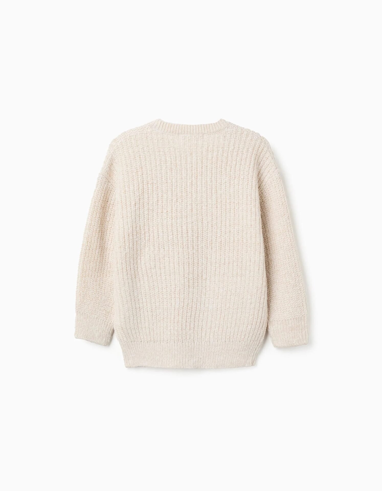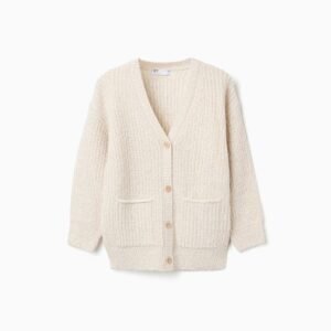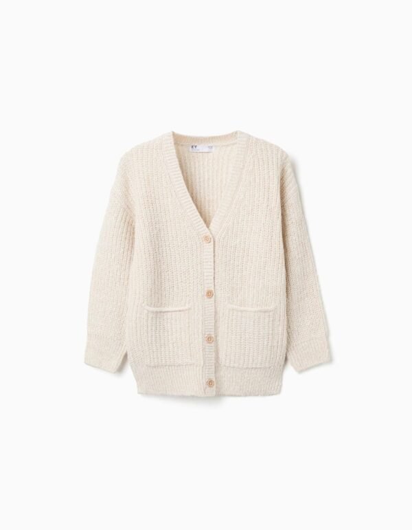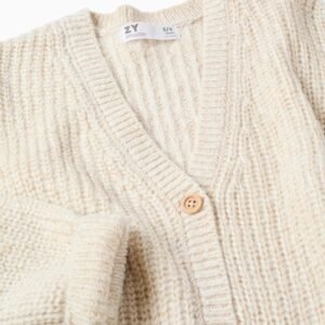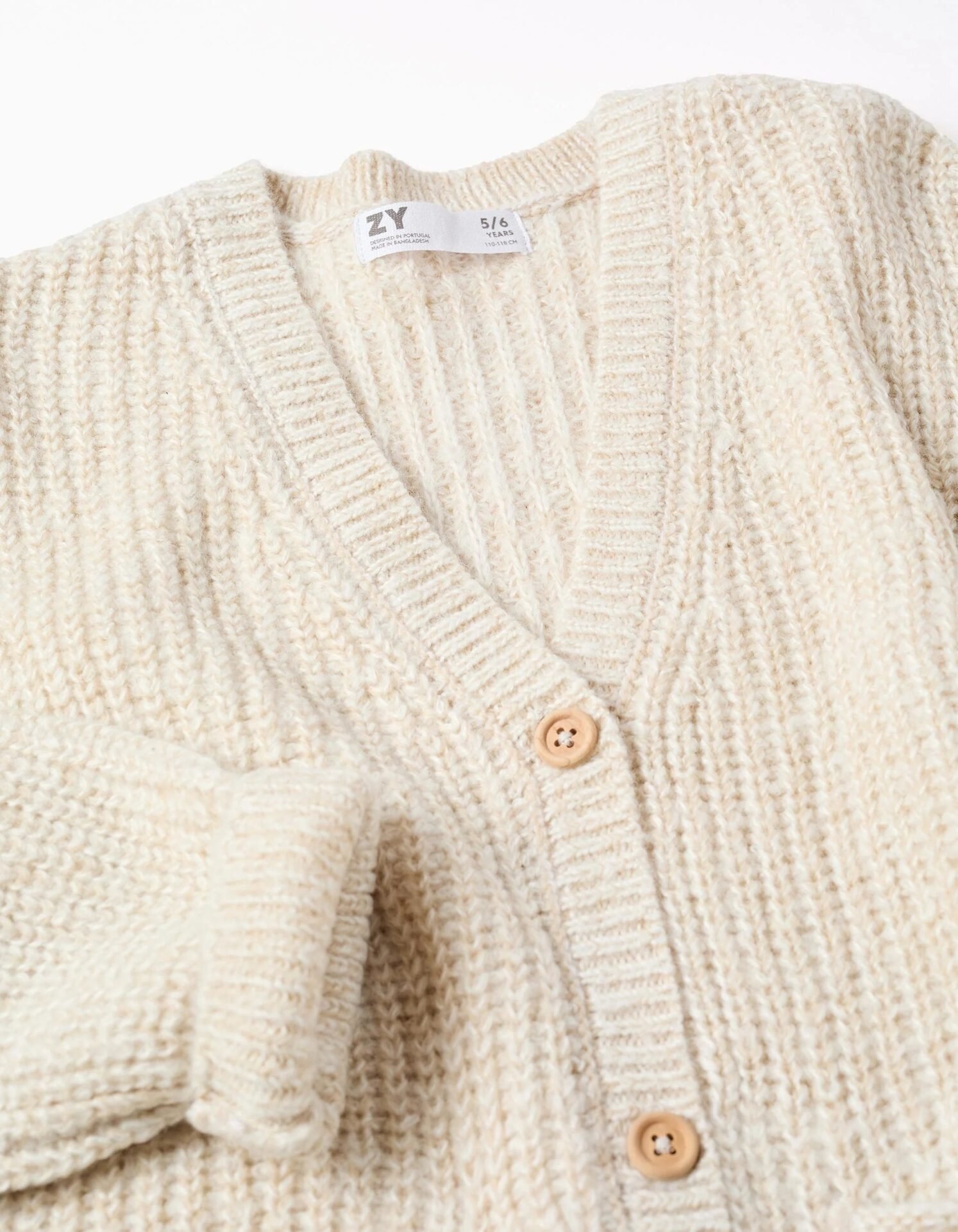 Chaqueta de punto grueso beige para niña. Escote en V. Se abrocha con botones. Contiene dos bolsillos delanteros. Extremos acanalados para un ajuste perfecto. Base asimétrica, ligeramente más larga en la parte trasera. Hombros caídos para un ajuste relajado. Una chaqueta cómoda y cálida, ¡perfecta para los días de invierno!