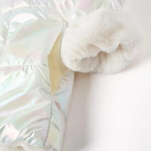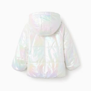 Chaqueta acolchada para niña, con capucha. Reversible, por un lado es iridiscente y por el otro beige, con pelo sintético para mayor comodidad. Bolsillos frontales en el lado beige. Cierre con cremallera. ¡Una prenda versátil y cómoda, ideal para dar un toque de color a los días más grises!