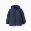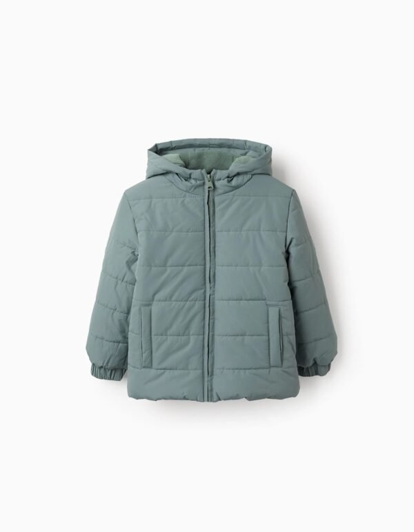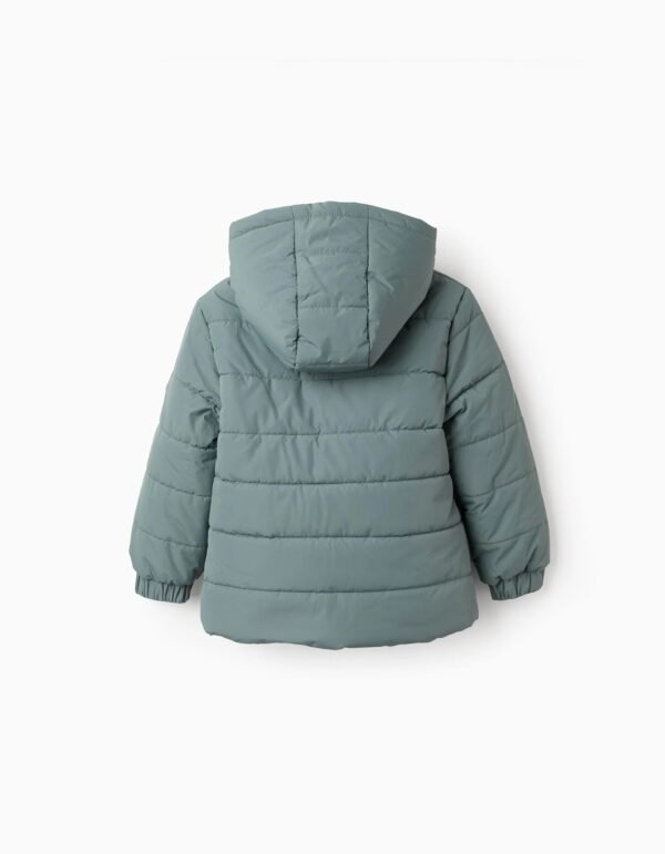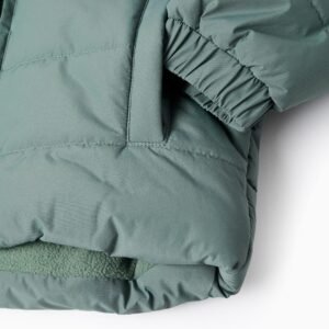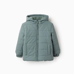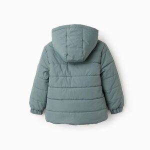Chaqueta acolchada verde para niño, con capucha y forro polar para máximo confort térmico. Bolsillos laterales. Puños elásticos para un ajuste perfecto. Etiqueta interior para poner el nombre del niño. ¡Un esencial del invierno! We Care: el relleno de esta prenda está compuesto por poliéster reciclado.