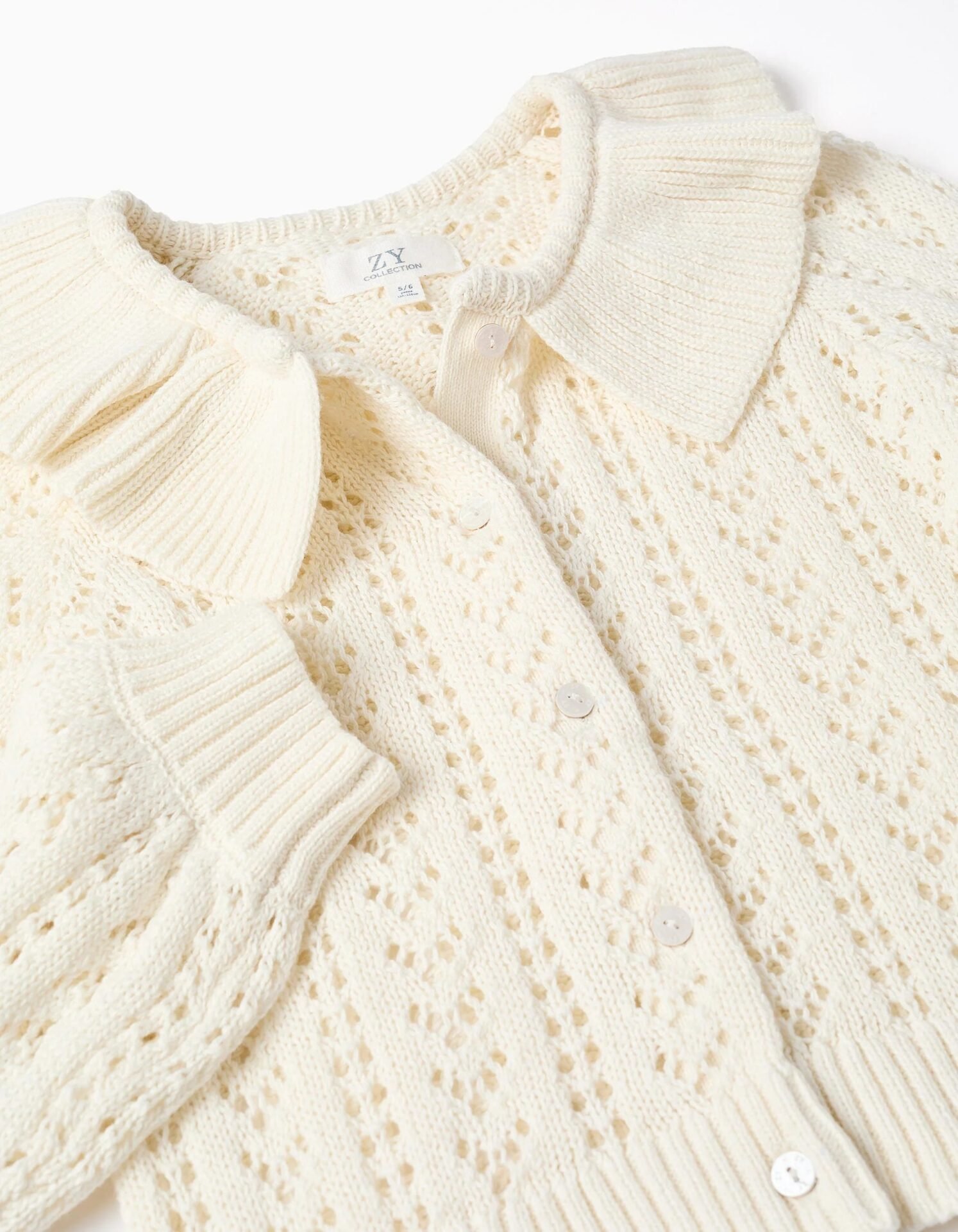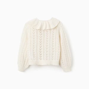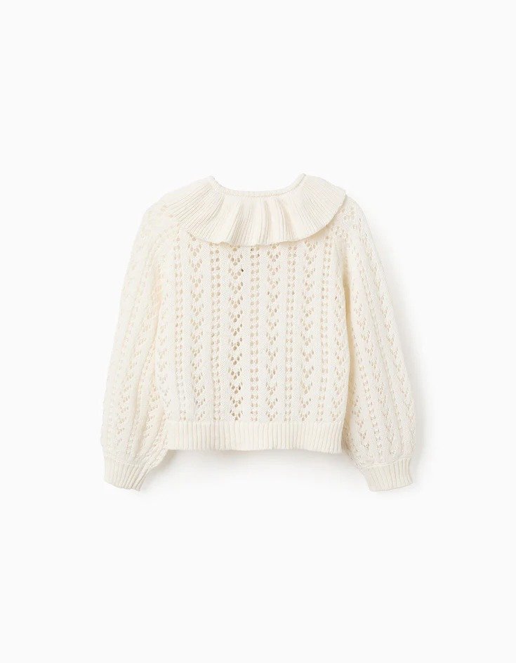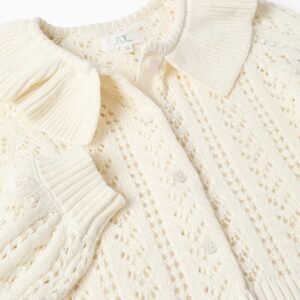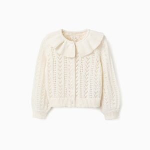 Cárdigan blanco de punto para niña—suave y transpirable sobre la piel. Fabricado en punto calado, es perfecto para eventos familiares y salidas. Es una prenda versátil, que combina fácilmente con varias blusas, vestidos y faldas, para looks cómodos y bonitos!