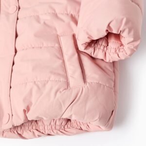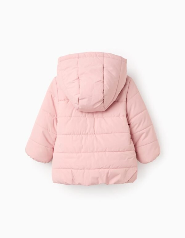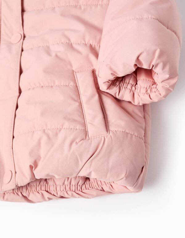 Chaqueta acolchada rosa para bebé niña, con capucha y forro polar para mayor calidez. Detalle de hoja en el centro. Bolsillos laterales. Se cierra con cremallera y automáticos para vestirla fácilmente. Bajo y puños ligeramente elásticos para un ajuste perfecto. Etiqueta interior para la identificación del niño. Una prenda versátil y cómoda, perfecta para el invierno. We Care: esta prenda está rellena de poliéster reciclado.