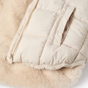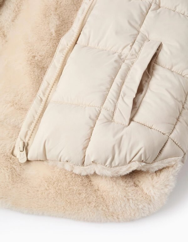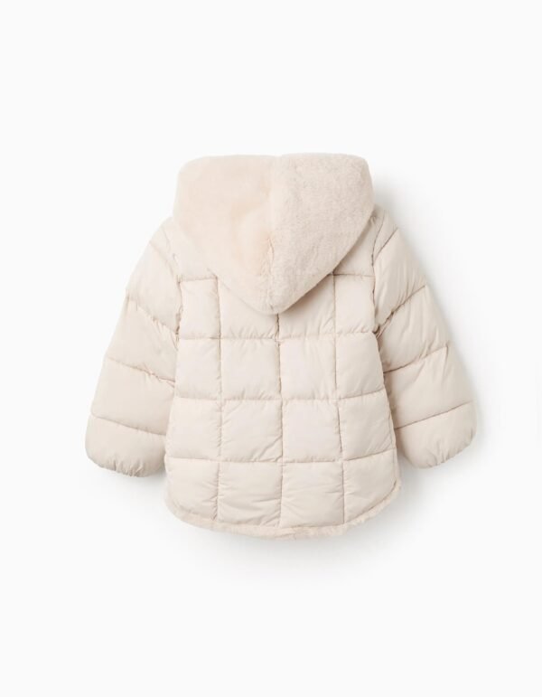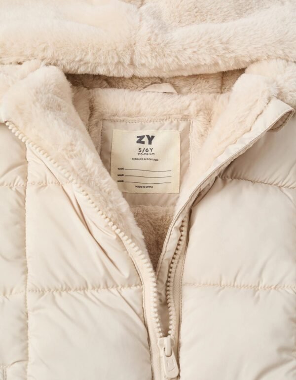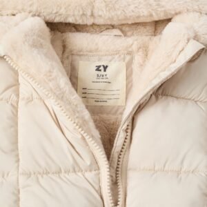 Chaqueta acolchado beige para niña, con forro afelpado para mayor suavidad y confort térmico. Con capucha. Puños elásticos para un ajuste perfecto. Base redondeada y asimétrica, ligeramente más larga en la parte de atrás. Cierre de cremallera. Etiqueta interior para poner el nombre de la niña. Una opción versátil y acogedora.