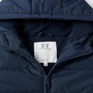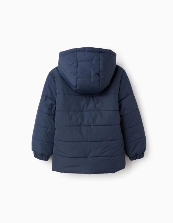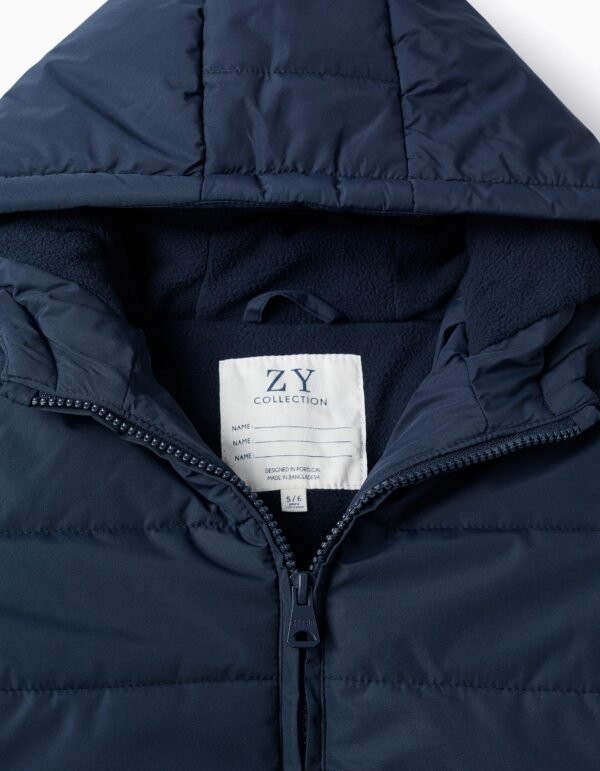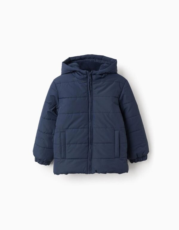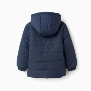 Chaqueta acolchada azul oscuro para niño, con capucha y forro polar para máximo confort térmico. Bolsillos laterales. Puños elásticos para un ajuste perfecto. Etiqueta interior para poner el nombre del niño. ¡Un esencial del invierno! We Care: el relleno de esta prenda está compuesto por poliéster reciclado.