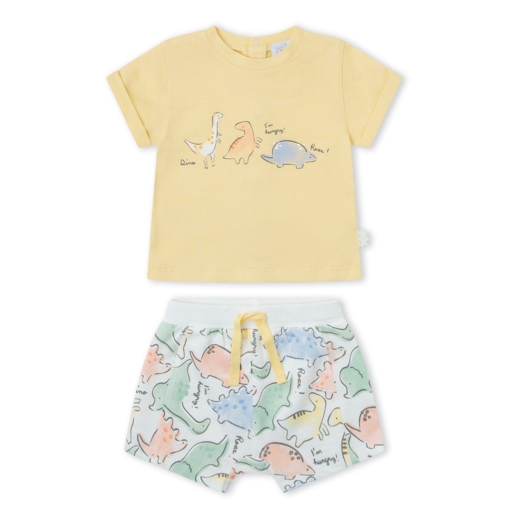 Conjunto de bebé confeccionado en algodón que combina camiseta de manga corta con dibujo en el pecho y pantalón corto estampado con cintura ajustable con cordón.