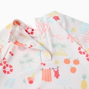 Deja que tu pequeña disfrute de las vacaciones de verano en este conjunto de baño, diseñado para comodidad y protección solar. Fabricado en tejidos ligeros, incluye una camiseta de manga larga blanca con un motivo relacionado con la playa y braguitas naranjas. Garantiza libertad de movimiento, siendo ideal para la playa, piscina o para jugar al aire libre. ¡El conjunto de baño perfecto para días activos y aventuras de verano memorables!