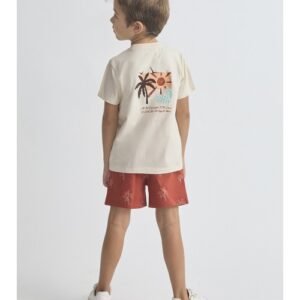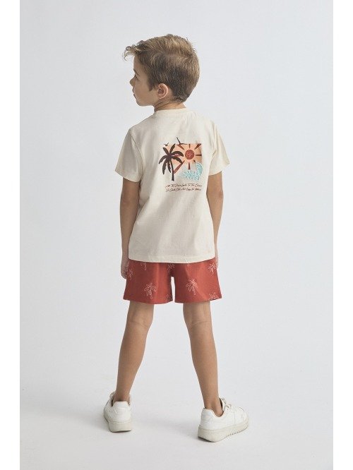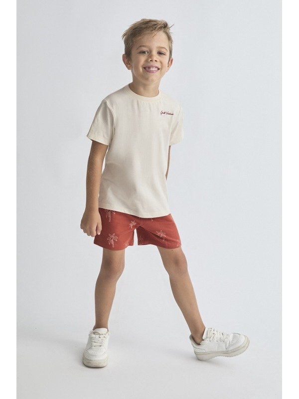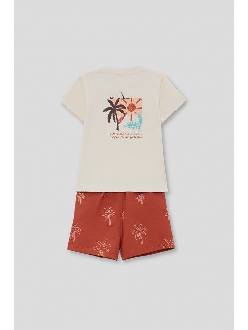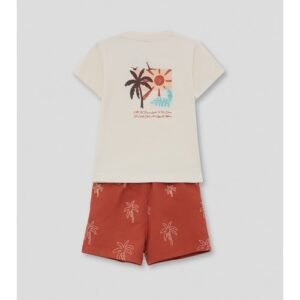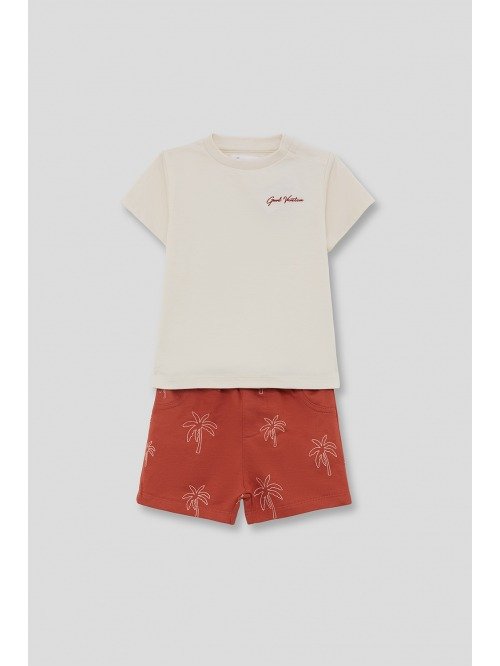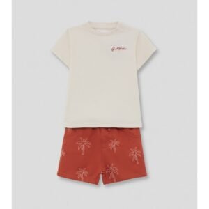Conjunto de dos piezas 100% algodón. Camiseta en color crudo con detalle bordado en el pecho con la frase Good Vibes. Shorts en color teja con estampado de palmeras y bolsillos delanteros. Cintura elástica para mayor comodidad. Confeccionado en algodón suave, ideal para los días de verano.
