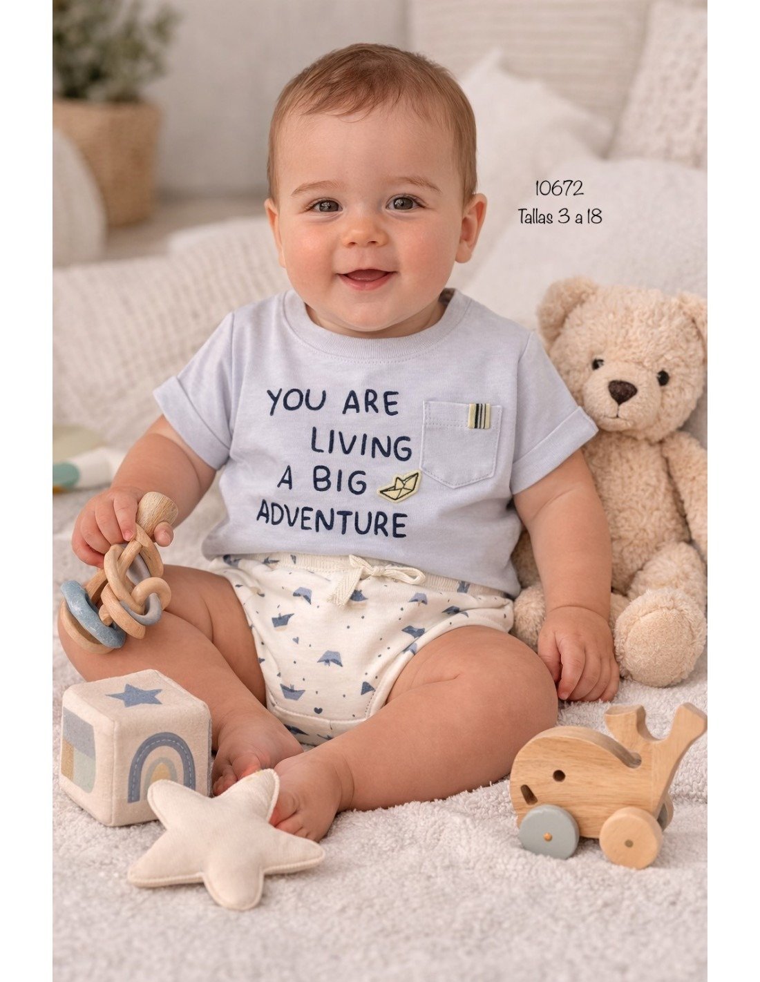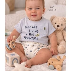 Conjunto de bebé niño ideal para los días más cálidos, confeccionado en suave algodón que aporta frescura, comodidad y libertad de movimiento. La camiseta de manga corta presenta un diseño dulce con mensaje frontal y pequeño bolsillo decorativo, que aporta un toque moderno y divertido. Se combina con cubrepañal estampado con cordón ajustable en la cintura para un ajuste cómodo y práctico. Un conjunto ligero, cómodo y perfecto para el día a día del bebé