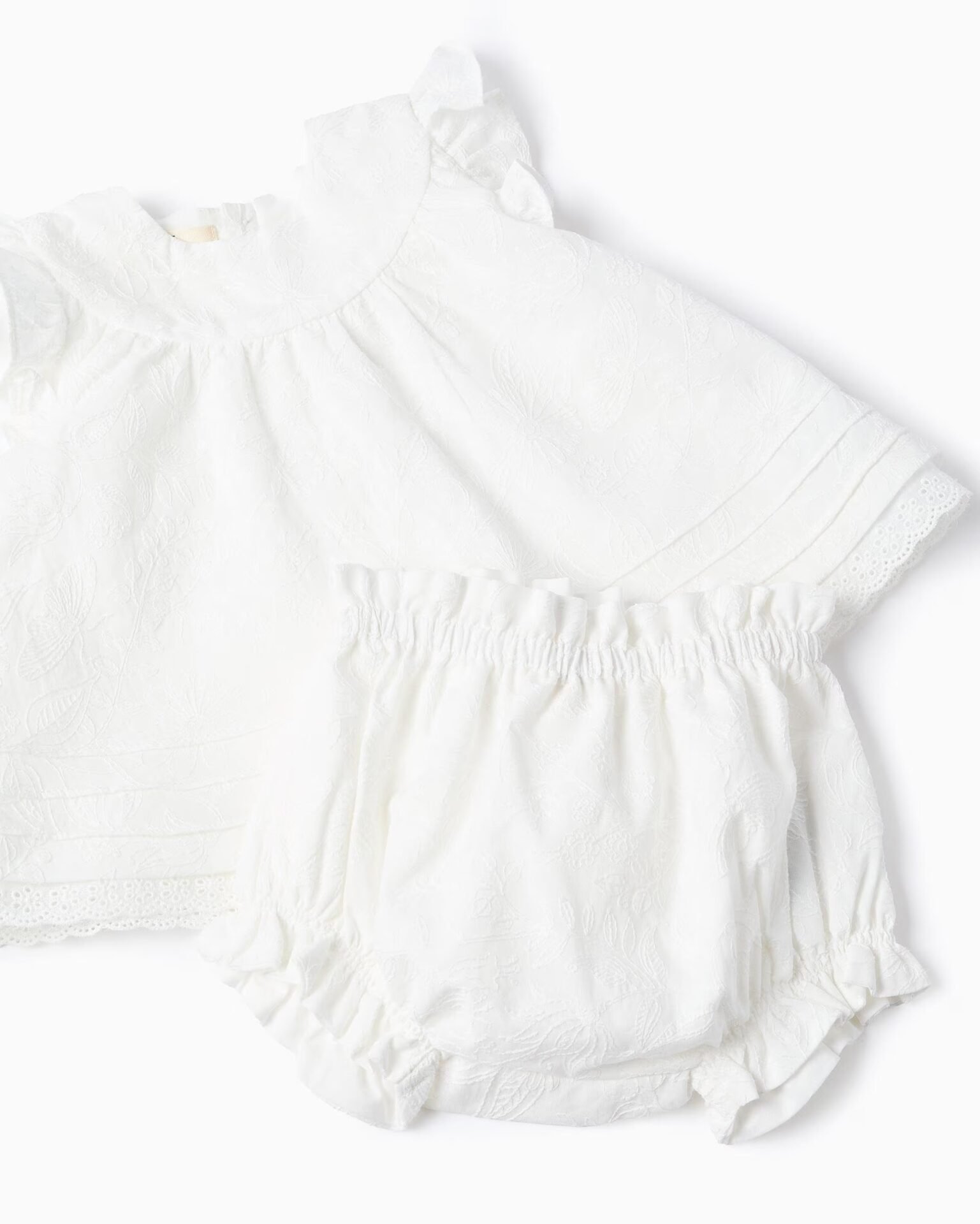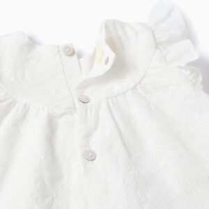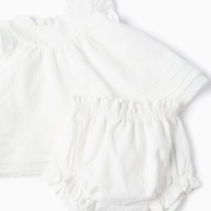 Descubre la elegancia de este conjunto, perfecto para tu recién nacida. Confeccionado en algodón suave, es ideal para que tu bebé esté cómoda durante los días cálidos. Incluye una blusa de manga corta y un cubrepañal a juego, ambos adornados con delicados volantes. Este conjunto es una opción versátil, ya que ambas piezas se pueden llevar juntas o por separado con otras prendas, lo que garantiza que tu bebé esté siempre a gusto. Conjunto de dos piezas, 100 % algodón. Ambas piezas con bordados delicados. Blusa con mangas cortas con volantes. Corte redondeado en el pecho con pinzas, para mayor volumen. Detalles plisados y de bordado inglés alrededor del