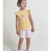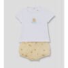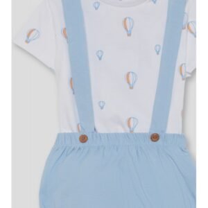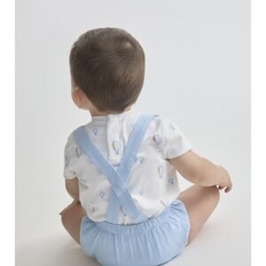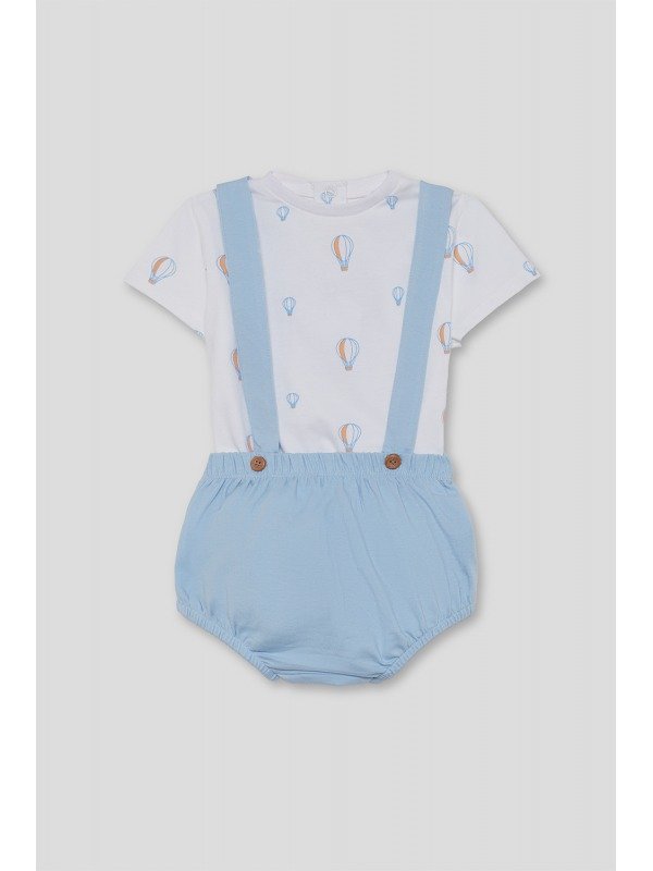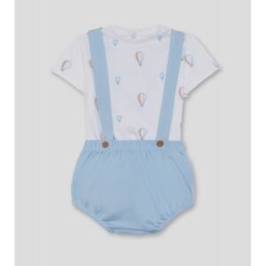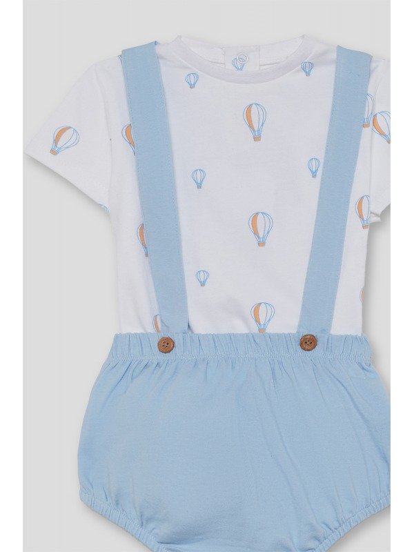 Conjunto de dos piezas para bebé niño. Camiseta blanca con estampado de globos aerostáticos en tonos celeste y naranja, con cierre trasero de botones para mayor comodidad. Braguita celeste con tirantes cruzados y botones decorativos en madera.