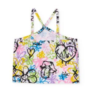 Conjunto de niña compuesto por un top multicolor y un short en color negro. El top presenta un diseño de tirantes finos cruzados en la espalda y un llamativo estampado de estilo grafiti con flores y elementos dibujados en tonos vibrantes, que aporta un aire moderno y expresivo. Su tejido ligero ofrece comodidad y libertad de movimiento. El short, en negro liso, incluye cintura elástica con cordón decorativo y bolsillos funcionales, proporcionando un ajuste cómodo y práctico para el día a día. Un conjunto versátil y lleno de carácter para disfrutar con estilo.
