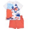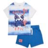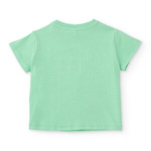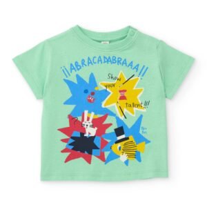 Conjunto de niño formado por camiseta verde y bermuda azul, confeccionado en tejidos suaves y cómodos ideales para el día a día. La camiseta destaca por su original estampado frontal de inspiración divertida, con formas llenas de color y personajes ilustrados que aportan un aire dinámico y alegre. Su cuello redondo y las mangas cortas garantizan una gran libertad de movimiento. La bermuda azul incorpora cintura elástica con cordón ajustable y prácticos bolsillos delanteros, ofreciendo comodidad y funcionalidad a partes iguales. Un conjunto fresco y lleno de energía para acompañar todas sus aventuras.