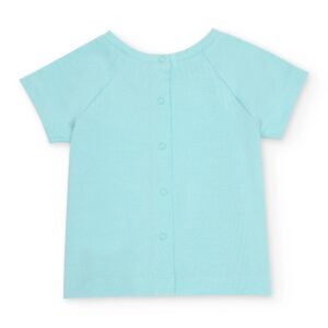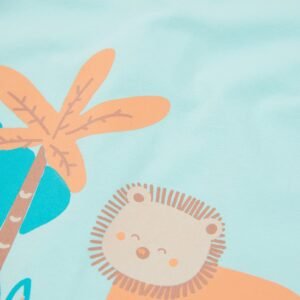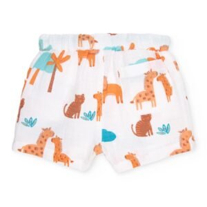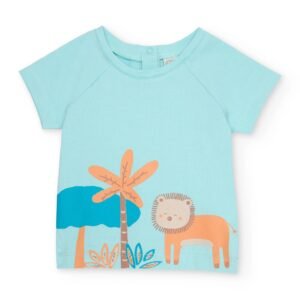 Conjunto de dos piezas para niño formado por camiseta y pantalón corto. La camiseta, en color azul claro, presenta un divertido estampado de un león entre árboles y vegetación, aportando un aire alegre y veraniego. Los shorts, de cintura elástica y cordón decorativo, muestran un estampado integral de jirafas, árboles y elementos de la sabana en tonos vivos. Un conjunto cómodo, fresco y perfecto para los días más cálidos.