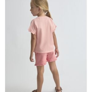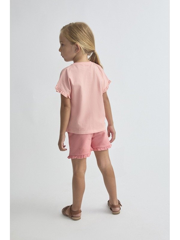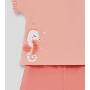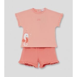 Conjunto de dos piezas, camiseta y shorts para bebé niña. Camiseta en color salmón con volante en las mangas y estampado de caballito de mar con detalle en relieve. Shorts a juego con volantes en el bajo y cintura elástica para mayor comodidad.