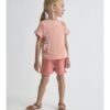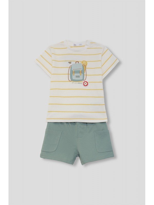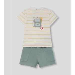 Conjunto de dos piezas, camiseta y shorts para niño. Camiseta de manga corta en blanco con rayas mostaza y estampado frontal de mochila con detalle “Let’s Go Camping”. Shorts en color verde con bolsillos delanteros y cintura elástica.
