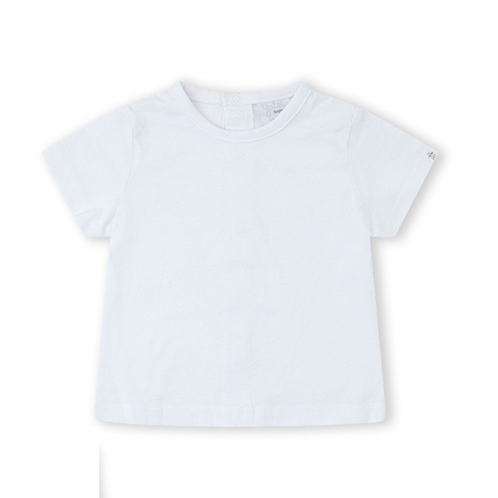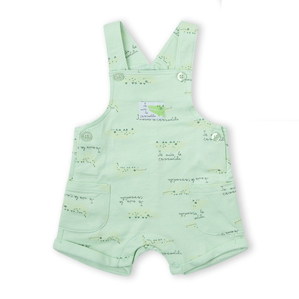 Conjunto para bebé confeccionado en algodón que combina peto estampado con bolsillos y camiseta de manga corta en color blanco a contraste.