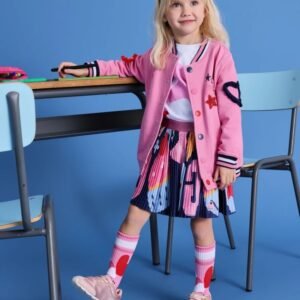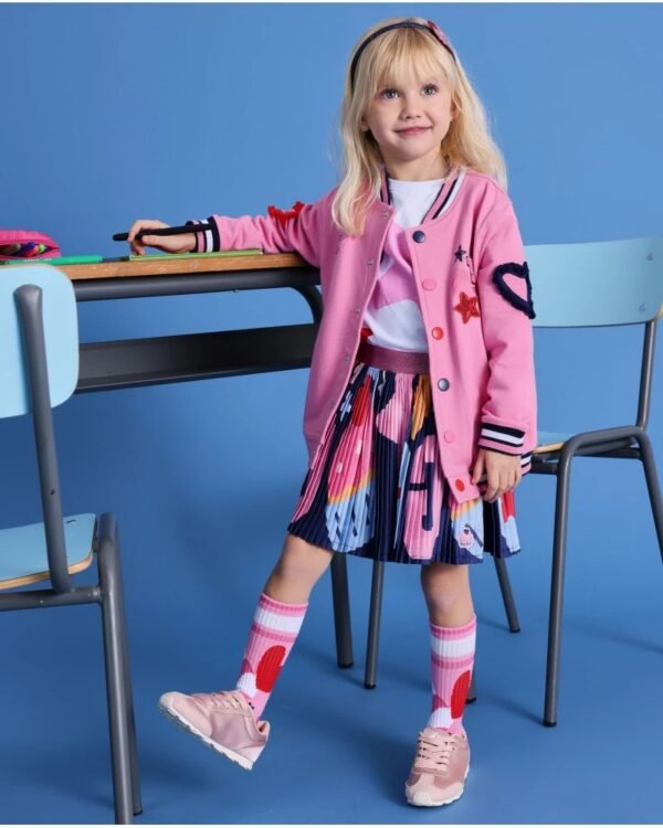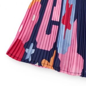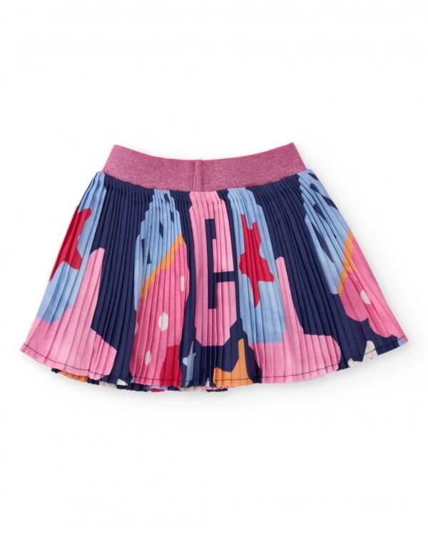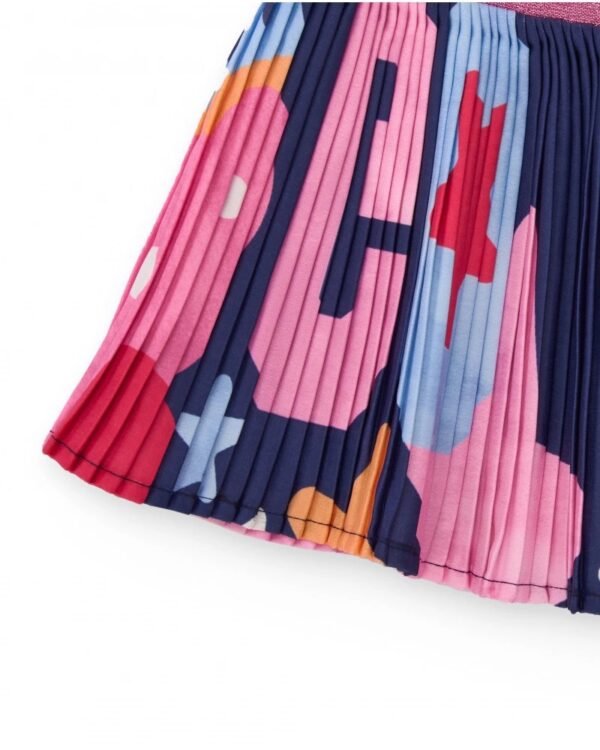 Falda para niña de diseño plisado que combina comodidad y estilo. Presenta un vibrante estampado multicolor con motivos gráficos y elementos divertidos como estrellas y cupcakes, en tonos predominantes de rosa, azul y rojo. La cinturilla elástica en color rosa con acabado brillante asegura un ajuste cómodo y un toque de brillo especial.