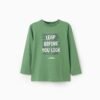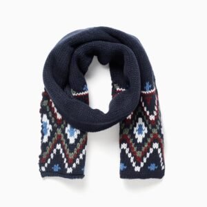 Conjunto de punto para niño, en azul oscuro, con jacquard en tonos blanco, azul claro, verde y rojo. Se compone de un gorro con vuelta acanalada y pompón en la parte superior. También incluye una bufanda con el mismo patrón jacquard en los extremos. ¡El conjunto perfecto para los días fríos!