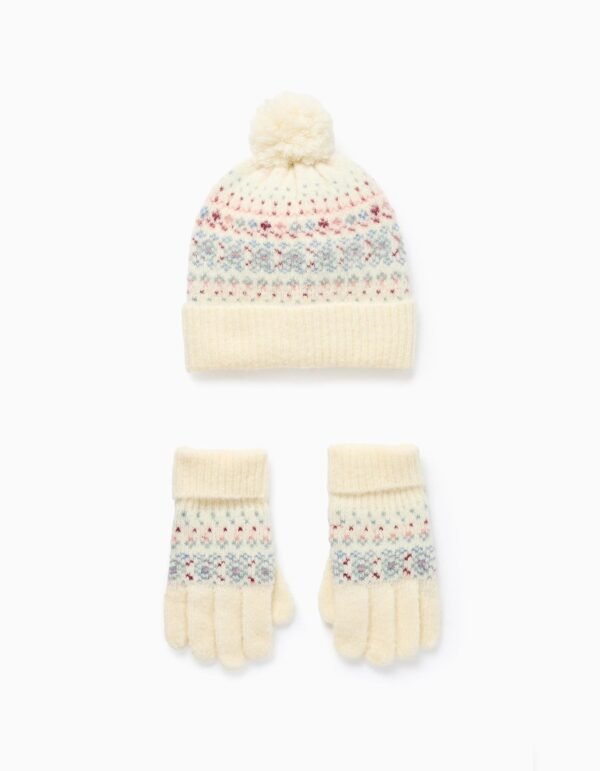 Este conjunto blanco incluye un gorro y un par de guantes con jacquard, en tonos rosa, azul y verde. Es perfecto para mantener a tu chica abrigada en los días más fríos. Confeccionado en punto suave que proporciona comodidad durante todo el día, este conjunto es ideal para la temporada de invierno. Perfecto para salidas familiares o juegos al aire libre, este conjunto es una opción esencial para el guardarropa de cualquier niña.